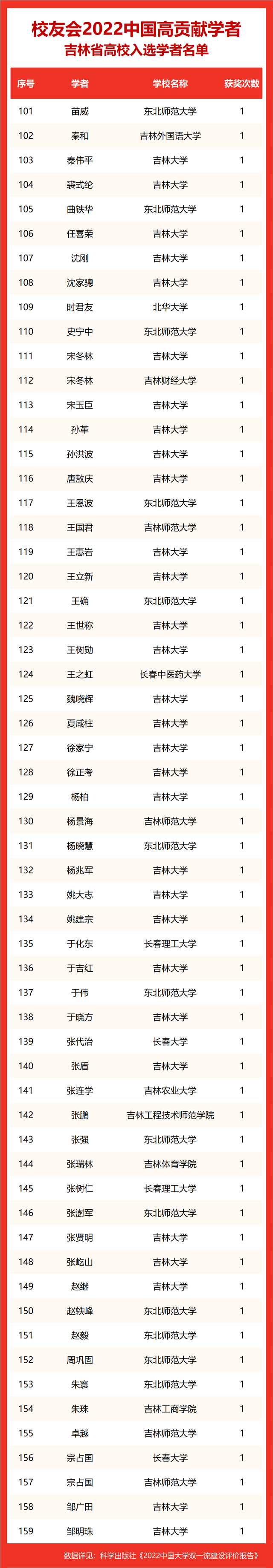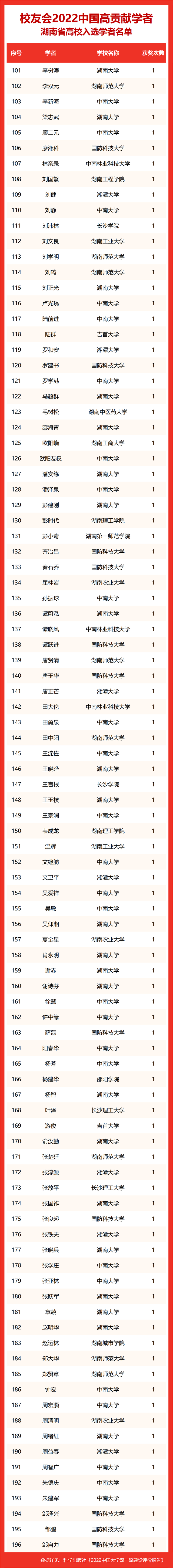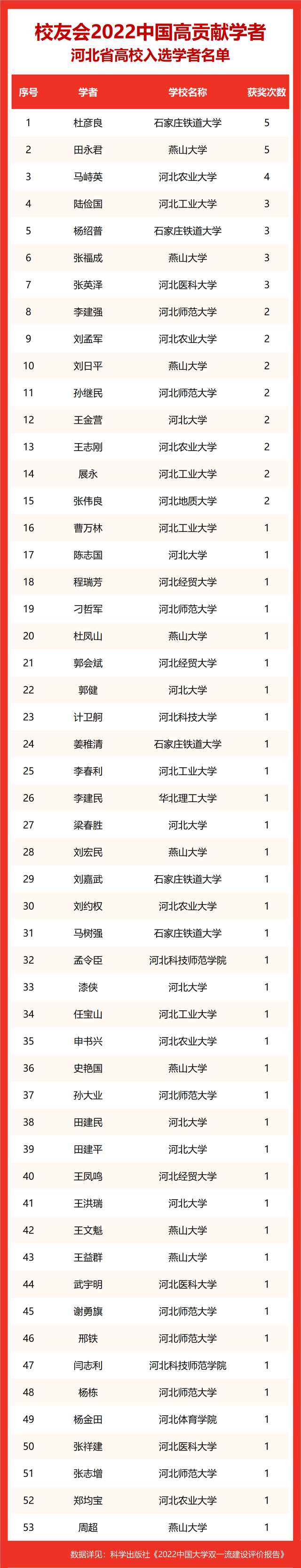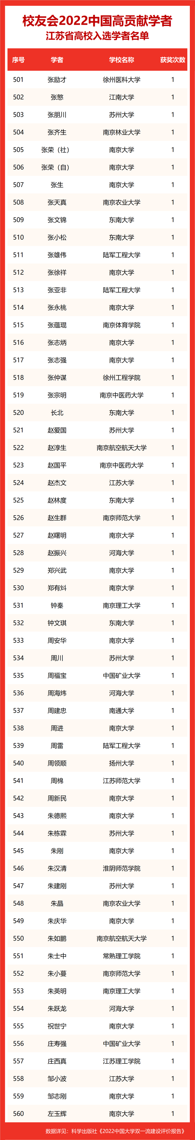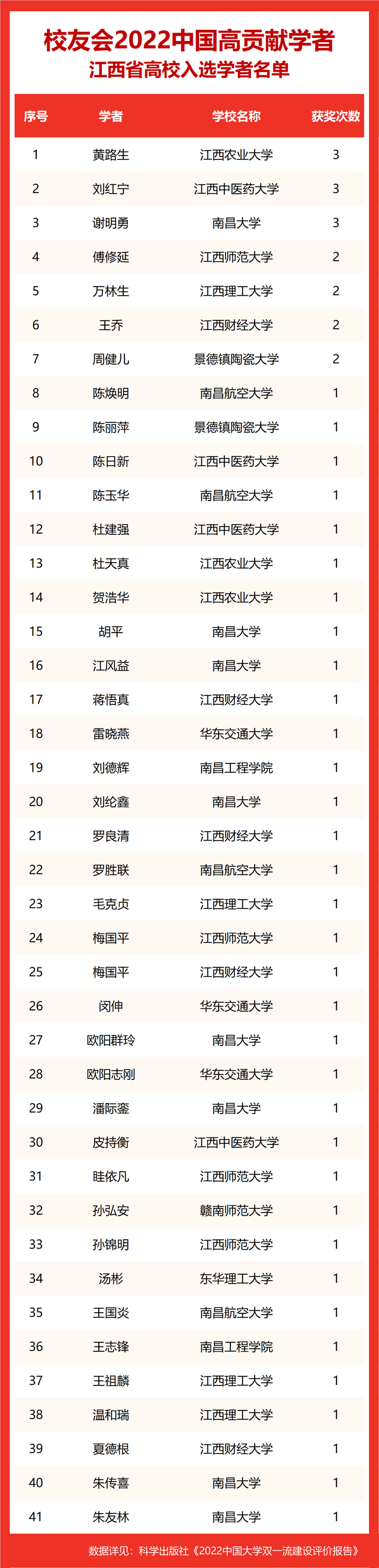 校友会2022中国高贡献学者遴选突出评价学者的教育教学水平、学术研究水平、创新质量和实际社会贡献,选择国家教学成果奖、国家科学技术奖励、教育部人文社会科学奖励、中宣部五个一工程奖、中国专利奖等12项社会各界公认权威主流、具有标志性代表性的指标作为评价标准,遴选标准科学客观统一,指标统计时间为2000-2021年。