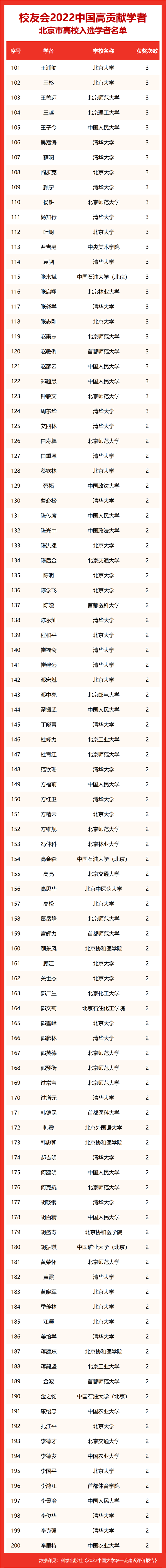 榜单显示,北京大学师资力量最为雄厚,国家级教学科研重大成果贡献能力最强,有326位入选,全国最多,雄居校友会2022中国大学高贡献学者排名榜首。清华大学255位,居第二。浙江大学178位,居第三;复旦大学165位,列第四;武汉大学147位,居第五;上海交通大学和中国人民大学分别有144人和141人入选,表现突出,挺进全国前七强。