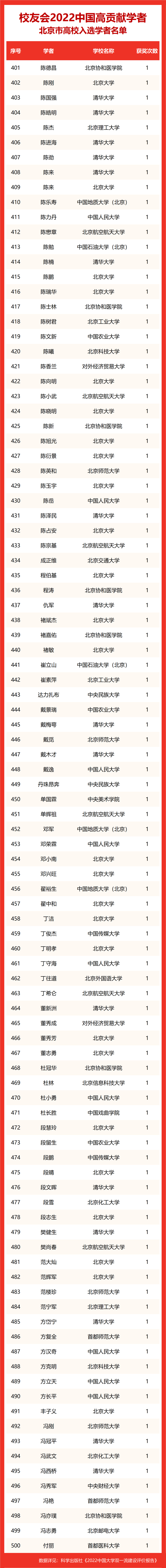 2022中国高贡献学者仅统计全国本科院校的入选学者情况,中国科学院大学、中国社会科学院大学由于办学时间较短,情况特殊,暂未纳入本年度学者的统计范围。令人感到惋惜的是,在入选学者中,部分学者已经过世,但他们为我国高等教育的发展做出了重要贡献。校友会2022中国大学高贡献学者排名如下: