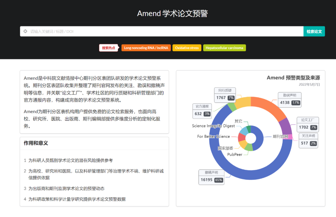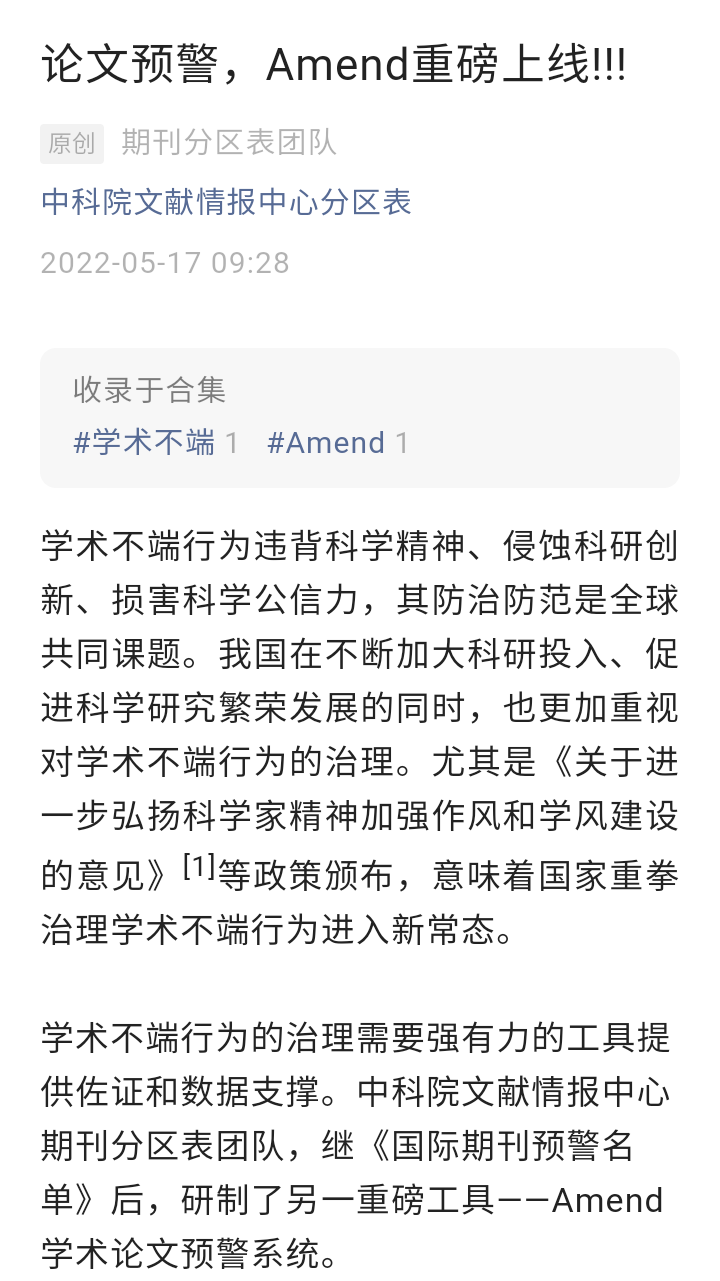 今天早上9点多,中科院文献情报中心发布了一个重磅通知:官宣中科院自己的学术论文预警系统——Amend学术论文预警系统正式上线!