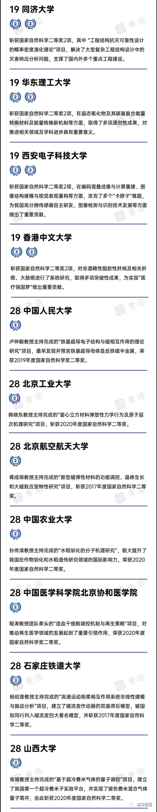 榜单显示,2016-2020年度,清华大学斩获国家自然科学一等奖1项、国家自然科学二等奖12项,居全国高校首位;复旦大学斩获国家自然科学一等奖1项、国家自然科学二等奖5项,在诸多领域取得国际领先的研究水平,居全国高校第二位;香港科技大学国家自然科学一等奖1项、国家自然科学二等奖2项,居全国高校第三位,为我国打破国外技术垄断作出了卓越贡献。
