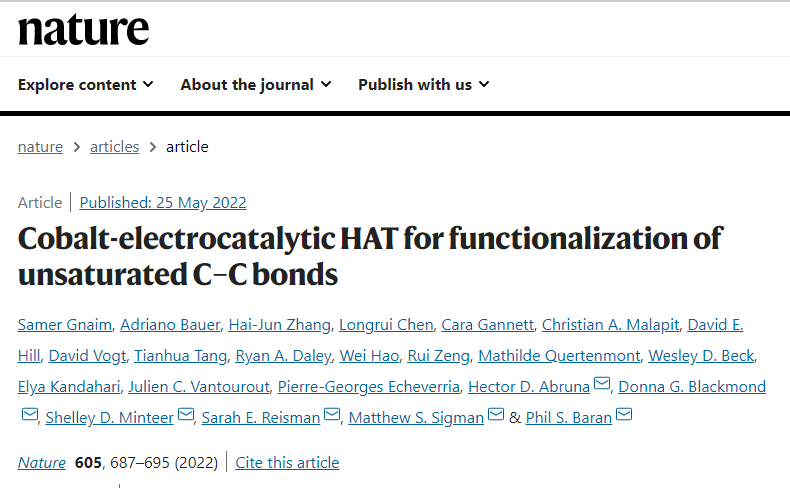 在此,来自美国康奈尔大学的Hector D. Abruna、犹他大学的Shelley D. Minteer & Matthew S. Sigman、加州理工学院的Sarah E. Reisman以及斯克里普斯研究所的Donna G. Blackmond & Phil S. Baran等研究者展示了,电催化方法如何受到几十年的能量储存研究的启发,可以在现代有机合成的背景下使用。相关论文以题为“Cobalt-electrocatalytic HAT for functionalization of unsaturated C–C bonds”于2022年05月25日发表在Nature上。