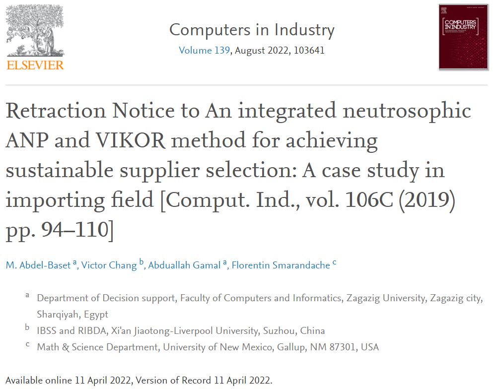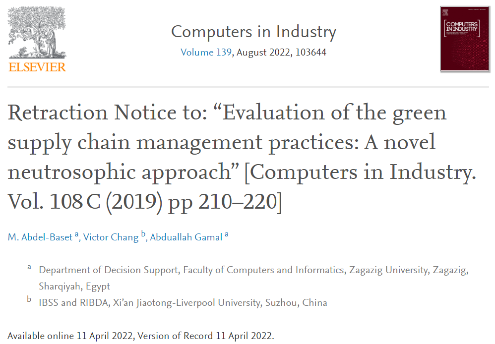 4月11日,爱思唯尔撤回了两篇发表在《工业计算机》(Computers in Industry,IF:7.635)上的专刊论文,撤稿原因非常“别致”: