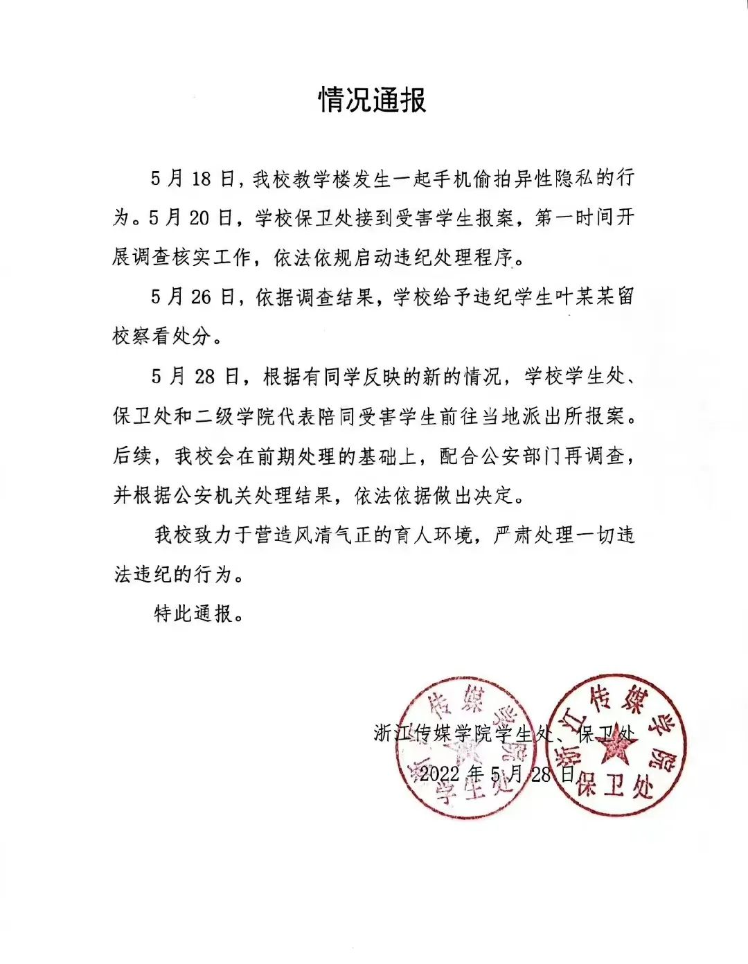 5月28日,浙江传媒学院官微发布情况通报,称对用手机偷拍异性隐私的学生叶某某留校察看处分后,根据有同学反映的新的情况,学校学生处、保卫处和二级学院代表陪同受害学生前往当地派出所报案。