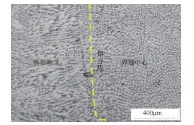 30CrMnSiNi2A钢TIG焊修复接头的形貌如图4所示,接头由焊缝区、熔合线、热影响区和母材区组成。接头微观组织如图5所示。焊缝中心主要为粗大等轴晶,靠近熔合线的焊缝区主要由柱状晶构成。这是因为熔融的填充金属首先从熔合线开始凝固,由于冷却速度较快,过冷度较大,容易生成柱状晶,焊缝中心凝固速度变慢且过冷度减小,更容易生成等轴晶。焊缝金属在冷却过程中经历了固态相变,首先形成奥氏体和铁素体组织,随着温度进一步下降,转化为板条马氏体和少量残留奥氏体[5] 。