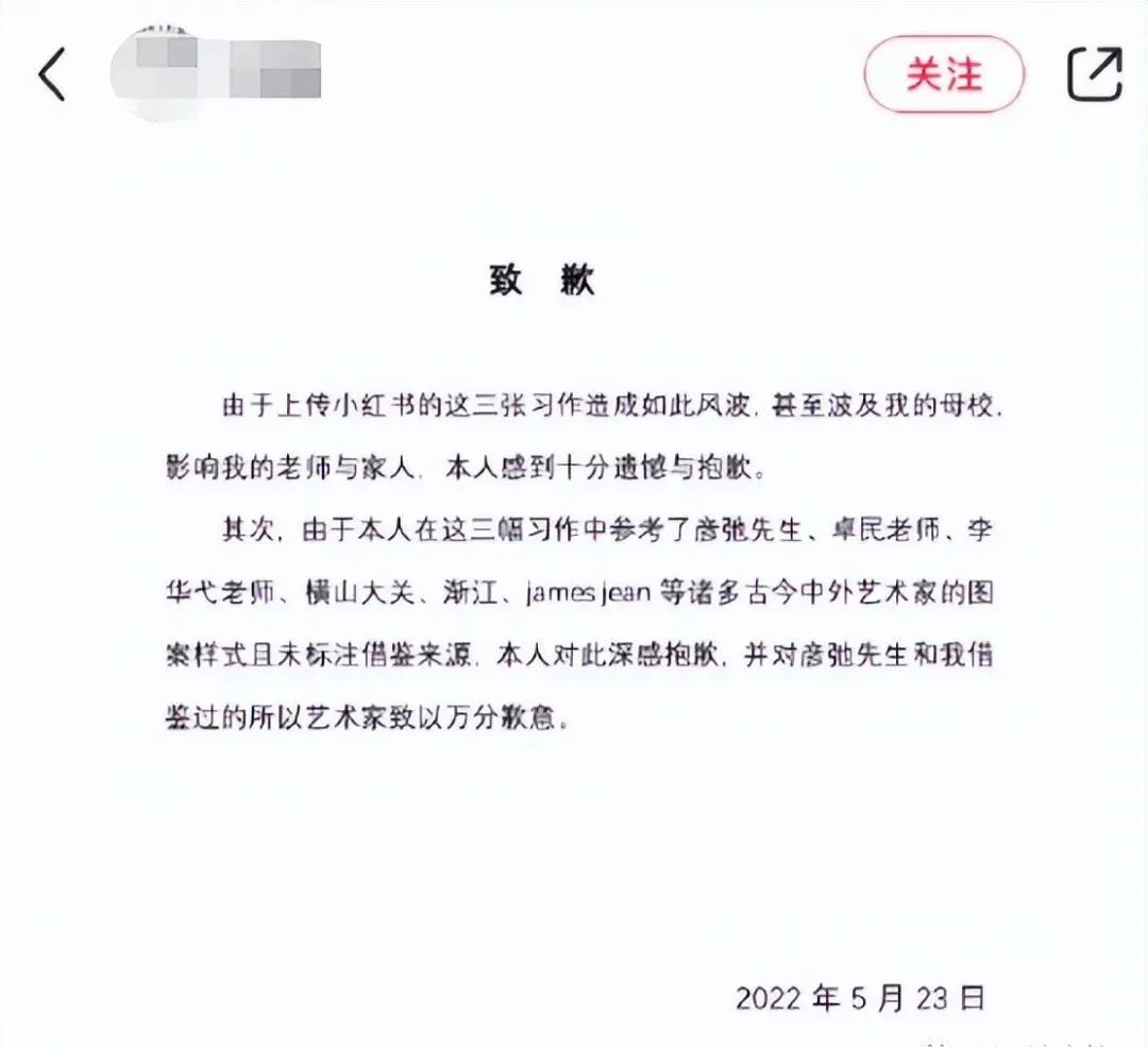 并表示,三幅作品为技法与材料训练的习作,非参展作品也非市场行为作品,并就参考古今中外艺术家的图案样式且未标注借鉴来源,”本人对此深感抱歉,并对彦驰先生和我借鉴过的所以(注:应为‘有’)艺术家致以万分抱歉“