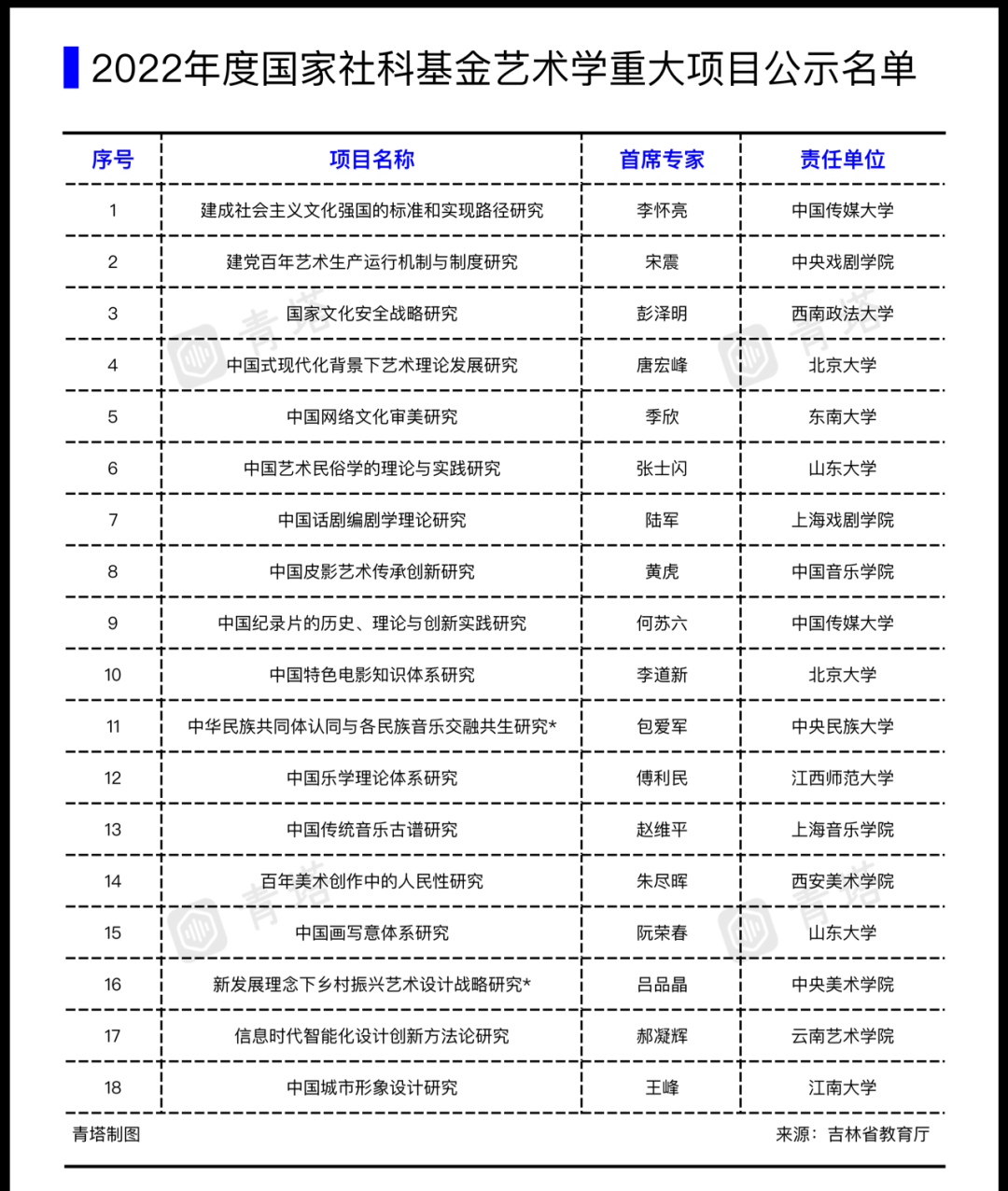 6月2日,全国哲学社会科学工作办公室发布《2022年度国家社科基金艺术学重大项目公示名单》。共有15所高校的18个项目入选。