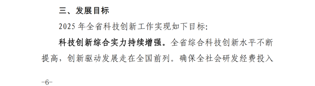 到2025年,全省科技创新攻坚力量体系和科技成果转化应用体系基本形成,全社会研发经费投入、高新技术企业数、每万人高价值发明专利拥有量等创新主要指标明显提升,区域创新能力保持全国第一方阵并争先进位,初步建成全国具有重要影响力的科技创新策源地和创新型省份。