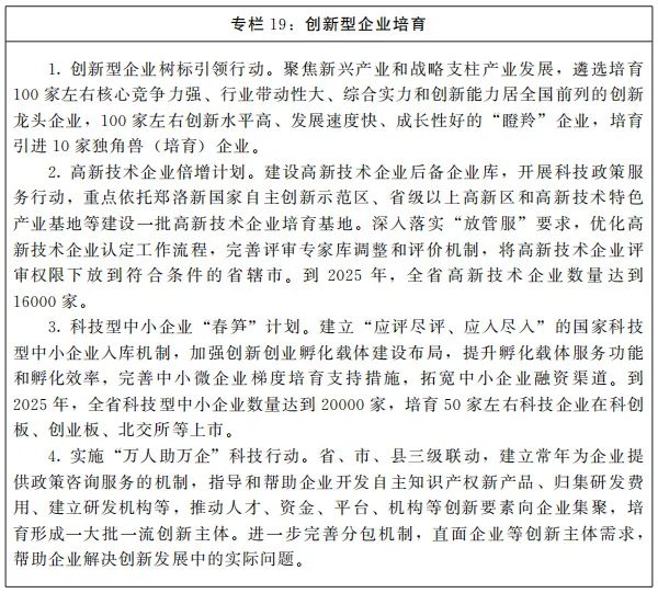 ——创新体系更加完善。建设10个省实验室,优化整合省重点实验室体系;打造技术创新中心体系,培育一批高能级创新平台;新增高新技术企业、科技型中小企业各1万家;创新人才加快汇聚。上下联动、内外融通、高效协同的全省科技创新新格局基本形成。