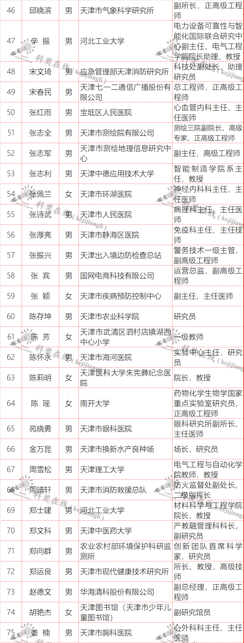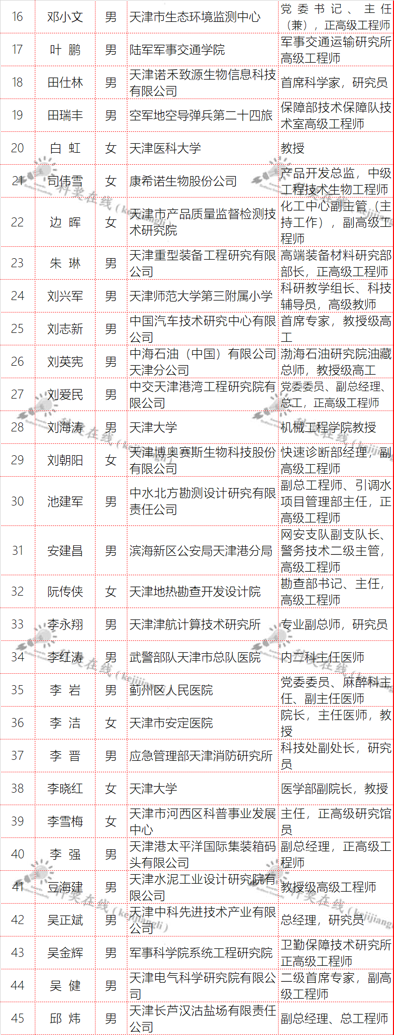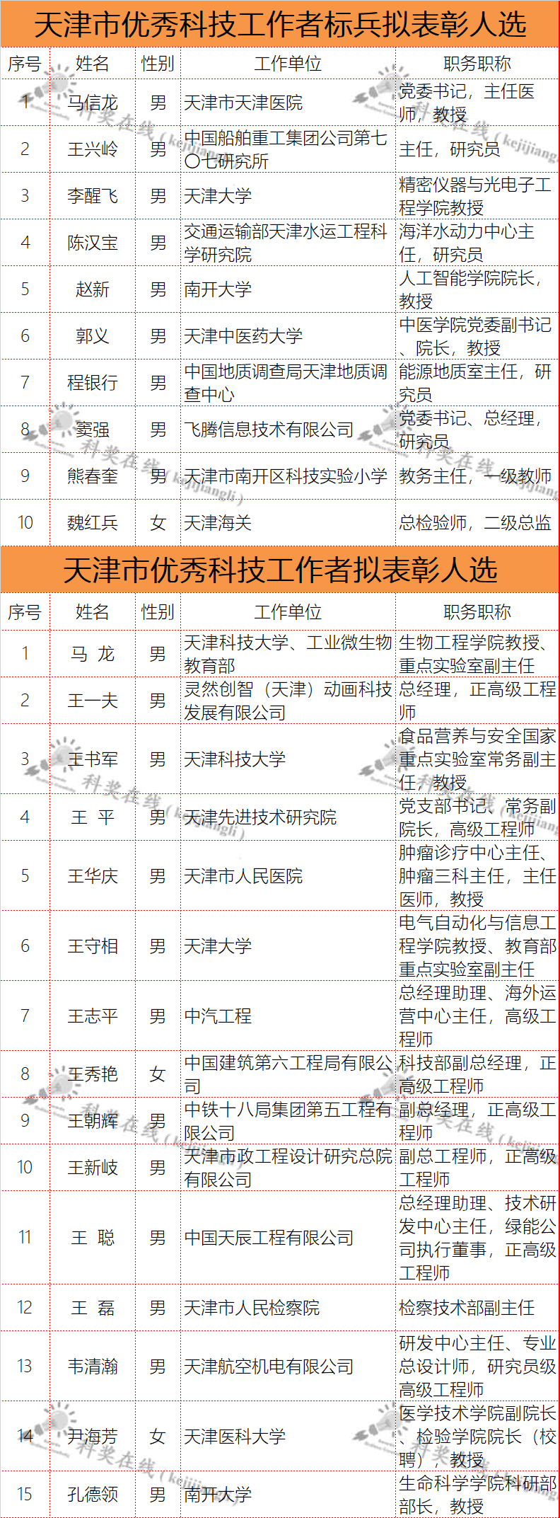 天津市优秀科技工作者标兵、天津市优秀科技工作者拟表彰人选公示