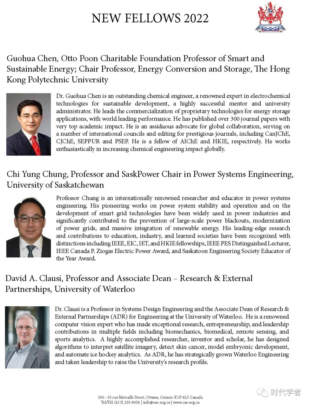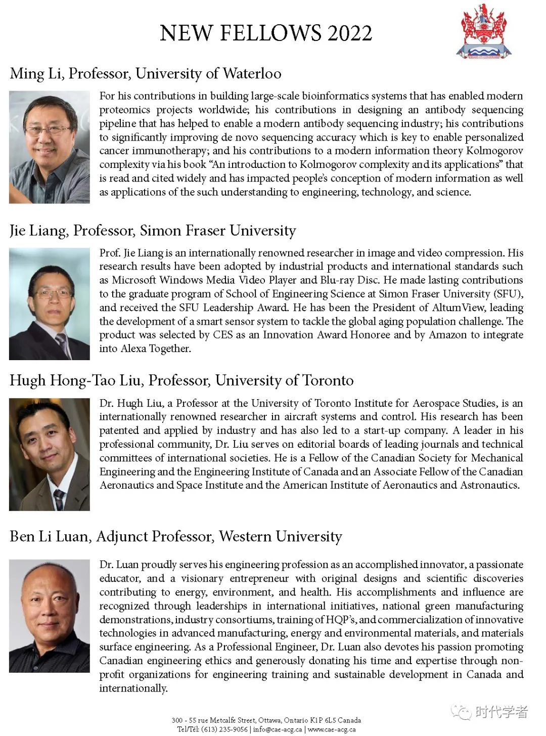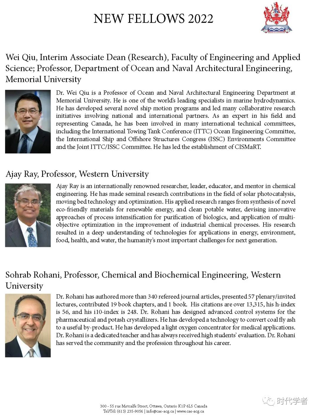 加拿大工程院(The Canadian Academy of Engineering)成立于1987年,是一个独立、自治的非盈利组织,入选人员由同行提名和选举产生,主要标准是参选者在研究领域的杰出成就和在工程专业上的长期服务。