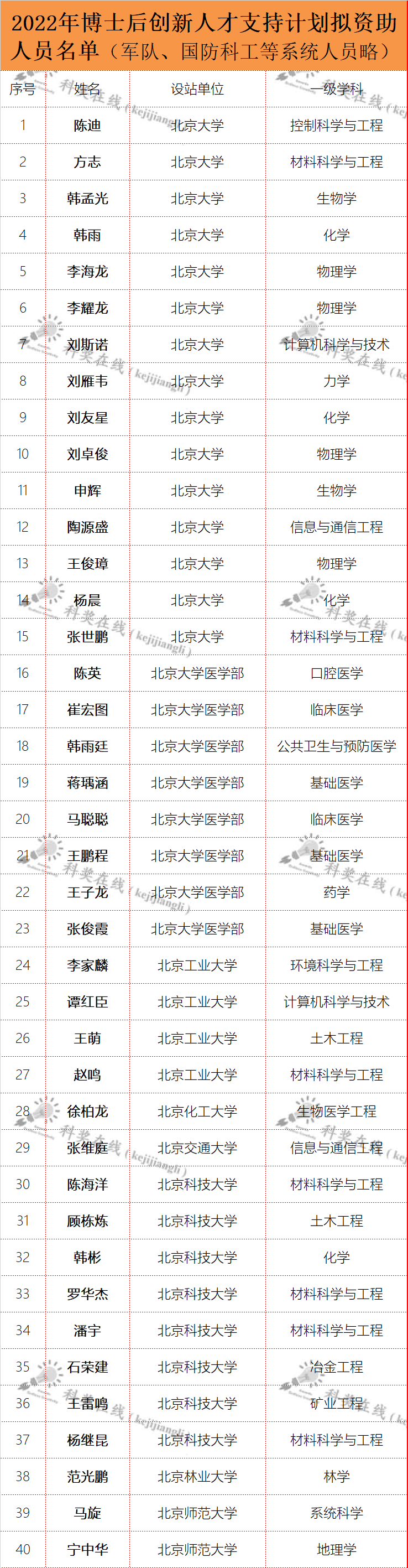 2022年度博士后创新人才支持计划拟入选人员
