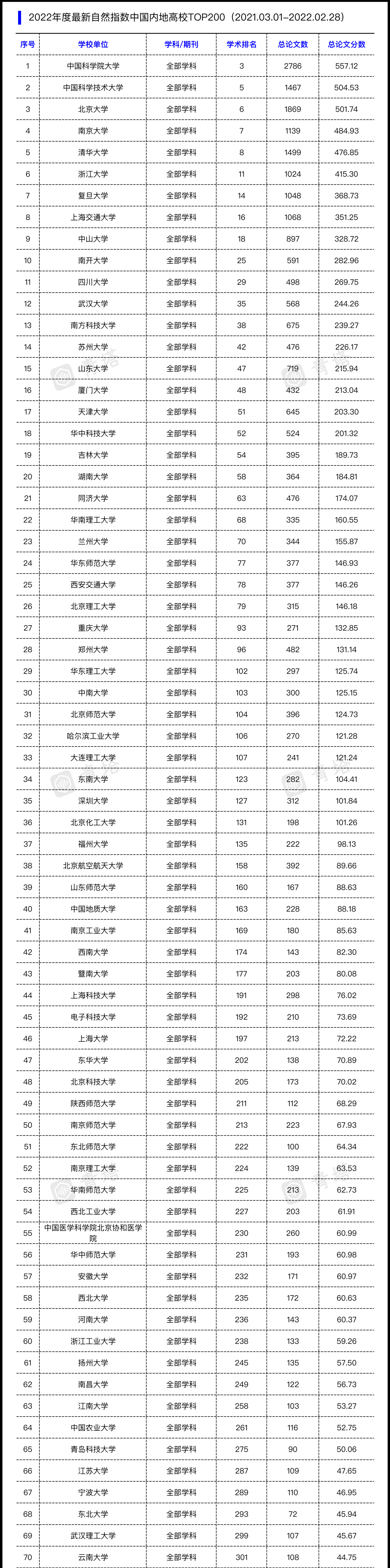 2022年最新自然指数综合排名中国内地高校TOP200排名结果如下(中国地质大学、中国石油大学在自然指数中没有按照地区进行区分):