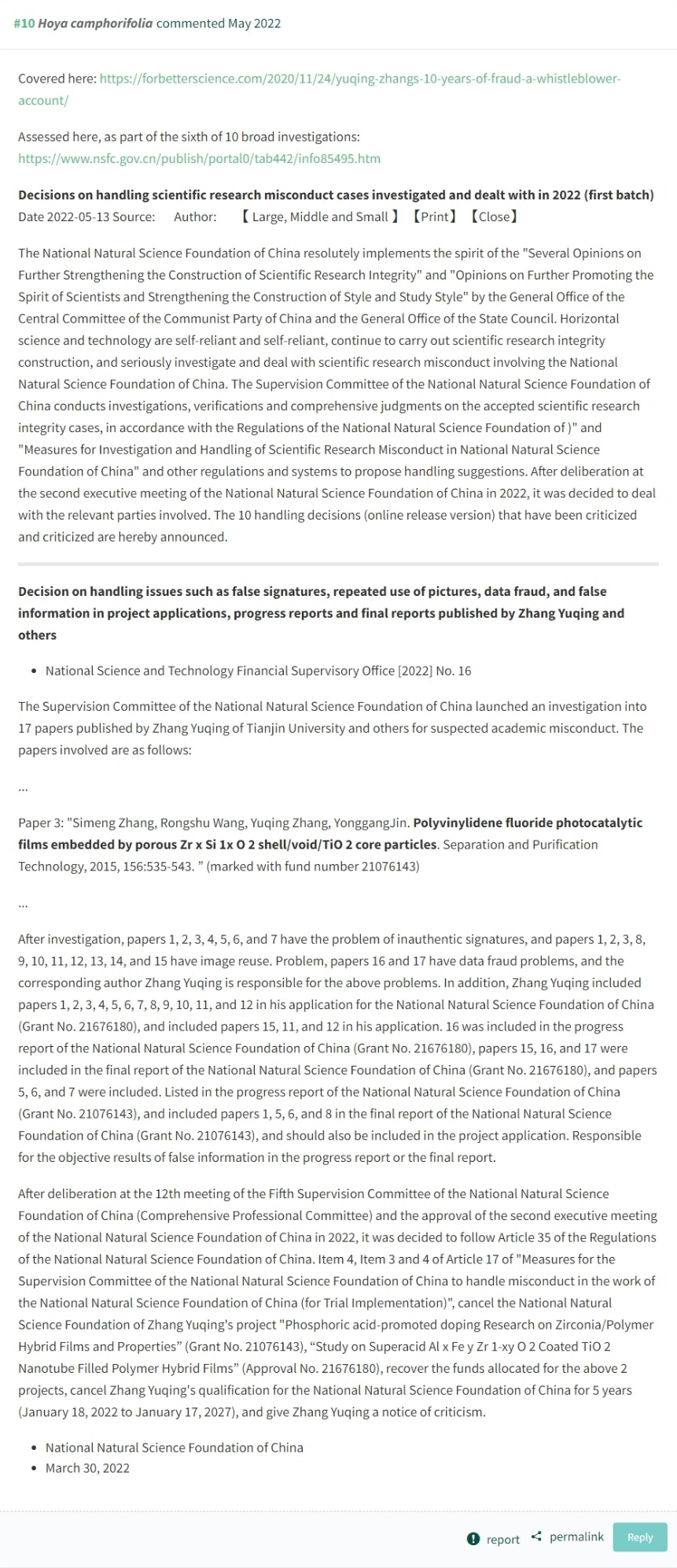 张裕卿教授以这样的态度去回应RSC Advance杂志,那也就不奇怪为何RSC Advance杂志会如此态度坚决的宣布单方面彻底撤稿。至于那个震惊了小编的针对国自然基金委处罚决定的表态是对学者Hoya camphorifolia 发在pubpeer上的英文版国自然通报的回复。
