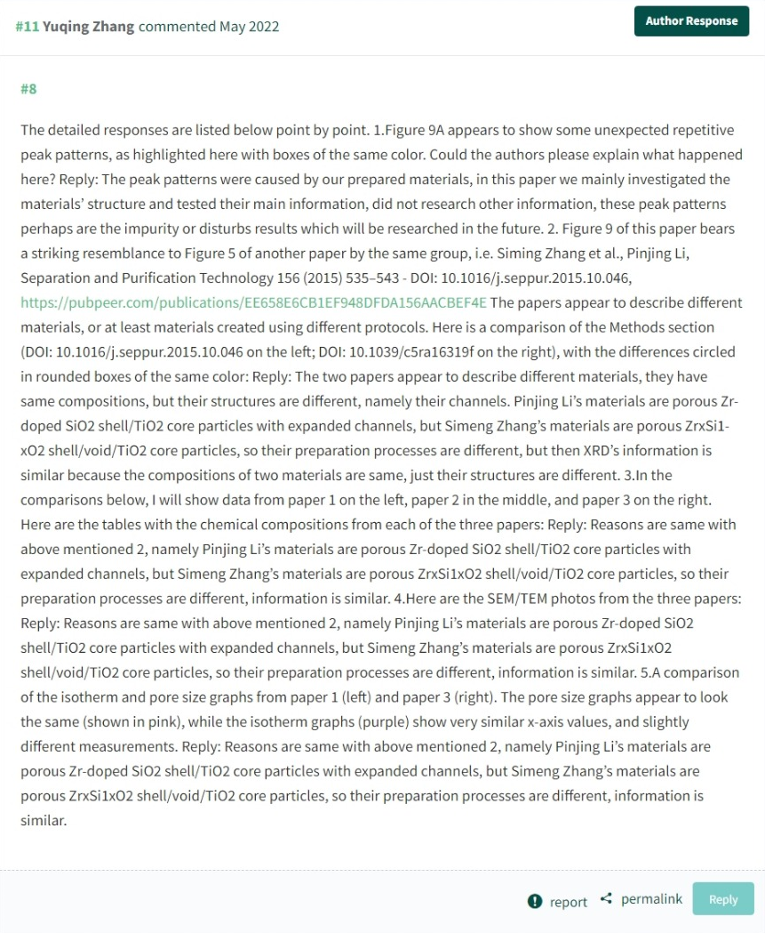 张裕卿是如何向RSC Advance编辑部和国自然基金委自辩的我们不得而知,但我们可以看看在Pubpeers上他是如何为自己辩解的。另外,由于张裕卿有数个回应是完全重复的内容,故以下仅展示他内容不重复的回应,并且已补全相关抄袭证据与原文信息。