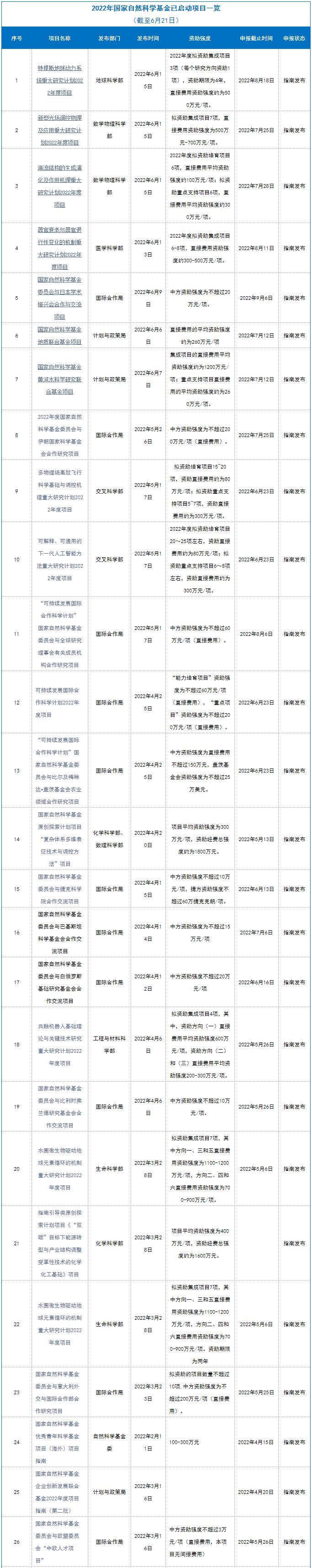 为了方便大家充分了解各项目情况,动源君将已启动项目从资助强度、申报截止时间、发布部门、发布日期、申报状态五个方面将近期发布的基金指南情况做了汇总,数据均来源于国家自然科学基金委员会官网,供读者参考。