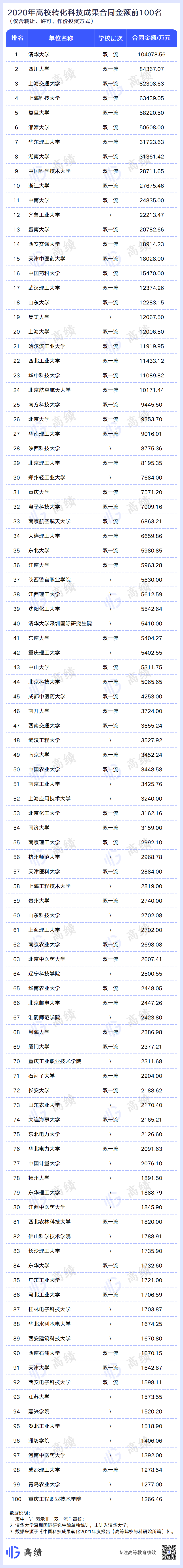 在2020年高等院校以转让、许可、作价投资三种方式转化科技成果合同金额排行中,清华大学以104078.56万元位列第一位;四川大学以84367.07万元位列第二位;上海交通大学以82308.63万元位列第三位;上海科技大学以63439.05万元位列第四位;复旦大学以58220.50万元位列第五位;湘潭大学以50608.00万元位列第六位。这六所高校合同金额超过5亿,位居全国高校前列。