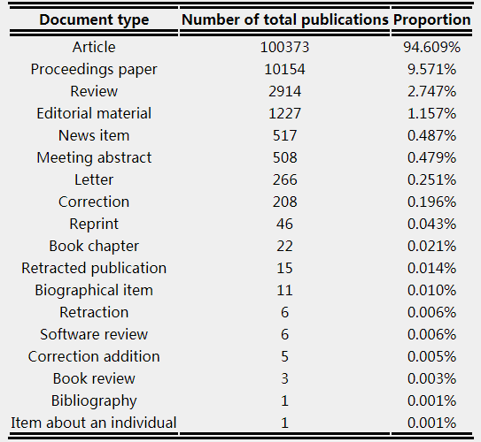 表4 1997~2017年全球腐蚀与防护领域SCI-E文献发表类型分布