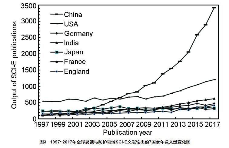 图3 1997~2017年全球腐蚀与防护领域SCI-E文献输出前7国家年发文量变化图
