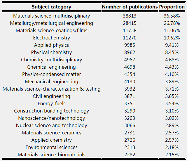 表8 1997~2017年间全球腐蚀与防护领域SCI-E文献学科类别分布