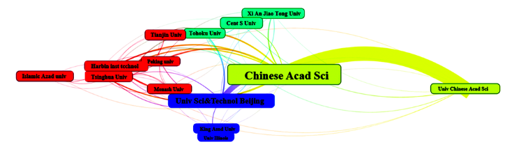在得到的106127篇文献中,有103559条记录来自于29954个机构,有2569条记录不包含机构信息。其中,发文量超过100篇的机构有316家,占到总机构数的68.37%;发文量超出500的机构有15家,占到总机构数的13.15%。表6展示了1997~2017年与2015~2017年全球腐蚀与防护领域SCI-E文献输出量排名前20的机构,图5展示了2015~2017年间全球腐蚀与防护领域SCI-E文献输出量排名前20机构聚类网络图。对2015~2017年间作分析是想对比得到近几年在该领域新出现比较活跃的机构。从统计结果中可以看出,发文量排名前20的机构中,中国的科研机构或者大学占了绝大多数,尤其在2015~2017年间,文献输出排名前9的机构均来源于中国,与图3中国近几年在该领域文献输出量的迅速增长一致,一定程度上反映出该领域在中国的研究热度远高于其他国家,也显示出中国近几年在腐蚀与防护领域的主导地位。但图4“>图4中中国的平均被引次数和h-index值并不是最高,也反映出中国各研究机构研究水平还需要提高的一个事实。从机构的角度来看,中国科学院是文献输出量最多的机构,1997~2017年间发文总量为3639篇,占到总机构数的3.43%;2015~2017年间发文总量为1273篇,占到总机构数的4.65%。造成这个现象的主要原因是中国科学院为中国自然科学最高学术机构、自然科学与高技术综合研究发展中心,在腐蚀与防护领域有着很专业的研究团队。同时,发文量排名前5的国家 (中国、美国、德国、印度、日本) 中,只有日本的东北大学、印度的印度理工学院、美国的俄亥俄州立大学进入1997~2017年间发文前20机构统计结果,印度理工学院和日本东北大学进入2015~2017年间发文前20机构统计结果,可以得出结论:发文量排名前几的国家中,中国、印度、日本在该领域的研究机构比较集中,分析原因是这几个国家在国内有专门的研究机构进行该领域的研究,而美国、德国等国虽然总的发文量很多,但在该领域的研究机构却比较分散。结合图4”>图4,还有一个原因是虽然美国、德国、印度、日本等国在该领域发文前20的机构不多,但其发文的文章质量较高。同时,从图5中可以看出,随着对腐蚀与防护领域相关知识体系研究的深入,近几年机构间的合作已经变得越来越频繁,图中线的粗细与密集度反应了机构之间的合作强度。机构之间的合作与国家之间的合作类似。