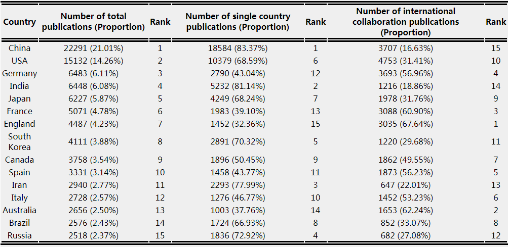 表2呈现了1997~2017年全球腐蚀与防护领域SCI-E文献输出量排名前15的国家。得到的106127篇文献覆盖了126国家,有2439篇文献 (2.298%) 没有地址信息。在103688篇有效文献中,中国在该领域SCI-E文献输出量为22291篇,对该领域全球SCI-E文献贡献量排名第一,所占比例21.01%;其次是美国,文献输出量15132篇,所占比例14.26%。中国和美国对该领域SCI-E文献输出量的贡献就占到了全球总输出量的1/3以上。排名前十的其余八个国家依次为德国 (6483;6.11%),印度 (6448;6.08%),日本 (6227;5.87%),法国 (5071;4.78%),英国 (4487;4.23%),韩国 (4111;3.88%),加拿大 (3758;3.54%) 和西班牙 (3331;3.14%)。同时,随着知识体系的扩大,国际科研合作也变得频繁,国际科研合作有助于各国科研人员集中全球热点问题与双方共同关注的领域,开展具有全球影响力的合作研究[20]。表2同样统计了发文量排名前15个国家的国际合作情况。可以看出,英国、澳大利亚、法国、德国、西班牙、意大利这几个国家国际间合作发表的文章量要多于本国单独发表的文章量,表明绝大多数发达国家在该领域的研究工作上更倾向于与其他国家进行合作。单独发表占自己国家总发文量比例比较高的几个国家中,发展中国家占了大多数,比如中国、印度、伊朗等国,表明这些国家在该领域的研究大多数还处于比较基础的阶段。中国的情况比较特殊,由于总发文量基数较大,从事该领域研究的科研机构和科研人员的科研水平有着较大的差异。不得不提的是,中国和美国不管是单独发表还是国际合作,其在发文量上相比其他国家还是占有巨大优势,这两个国家对该领域贡献是比较显著的。