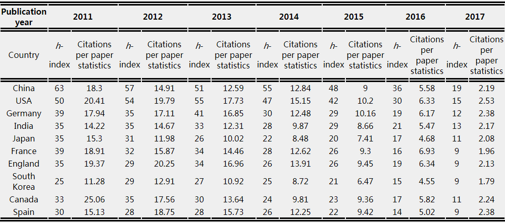从图中可以看出,代表发展中国家的中国和印度,在该领域文献输出的年增长速率要明显高于其它5个发达国家的平均水平,尤其以中国最为明显。2000年左右中国在该领域年文献输出量便呈现出爆发式增长,2006年的年文献输出量超过美国 (2005年中国537篇,美国634篇;2006年中国649篇,美国607篇)。在此之后,无论是在该领域年SCI-E文献输出量,还是文献增长率,均排名全球第一。2017年中国在该领域SCI-E文献输出量更是达到3420篇,约为美国3倍 (1204篇) 以及其余5个国家平均文献输出量的8倍。同样的情况也发生在印度。印度近几年在该领域年SCI-E文献输出量增长明显,2017年在该领域文献输出量为621篇,仅低于中国和美国。照此发展,很有可能在未来超过美国。相比发展中国家,代表发达国家的其余5国在该领域年SCI-E文献输出量增长缓慢,仅美国有较为明显的增长趋势。综合各方面因素,可以分析得出:发达国家在该领域研究相对比较前沿,科研平均水平高于发展中国家,这也能从图4中h-index与每项平均被引次数看出。发展中国家的优势在于其每年巨大的文献输出量与众多的研究团队,加上国家在这些基础研究领域的持续投入,对该领域的贡献以及研究水平会越来越接近全球的领先水平。