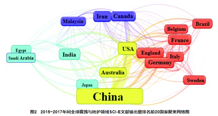 图2 2015~2017年间全球腐蚀与防护领域SCI-E文献输出量排名前20国家聚类网络图