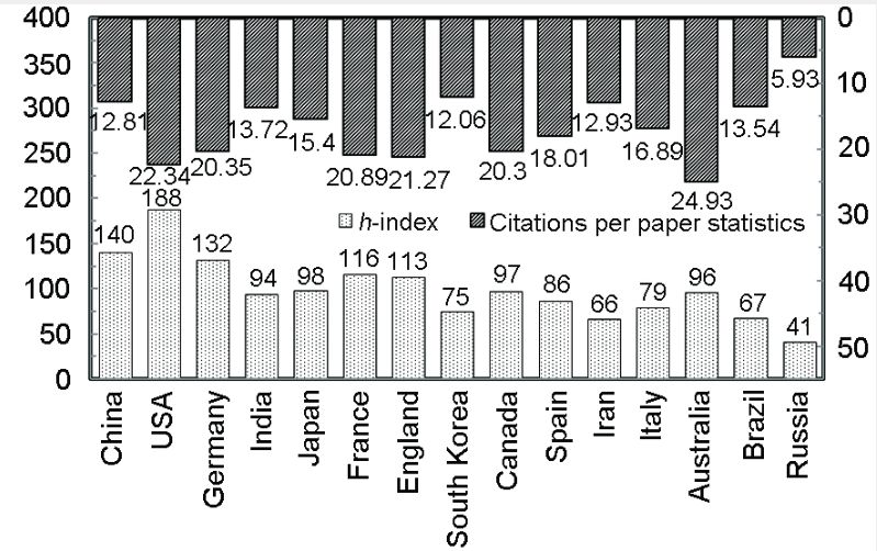研究一个领域全球SCI-E文献输出总量可以直观反映该领域的整体发展情况以及各个国家在该领域的投入情况,而从检索结果中通过创建引文报告,分析一个国家的h-index值与平均被引次数可以从另一个角度看出一个国家科研水平的高低 (h-index值基于以“被引频次”计数降序排列的出版物列表,值为h的索引表明有h篇文献已被引用至少h次;每项平均引用次数为被引频次总计除以集合中的结果数)。