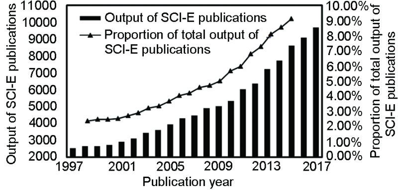 图1 1997~2017年全球腐蚀与防护领域SCI-E文献输出总量年增长趋势图