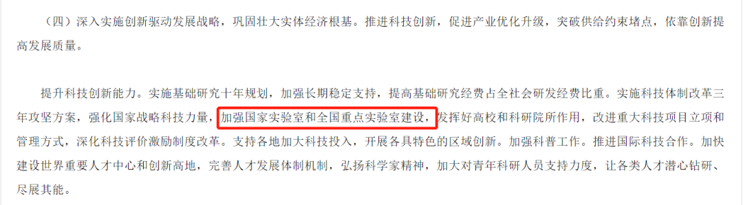 此外,2022年政府工作报告中同样提出,“实施科技体制改革三年攻坚方案,强化国家战略科技力量,加强国家实验室和全国重点实验室建设”。