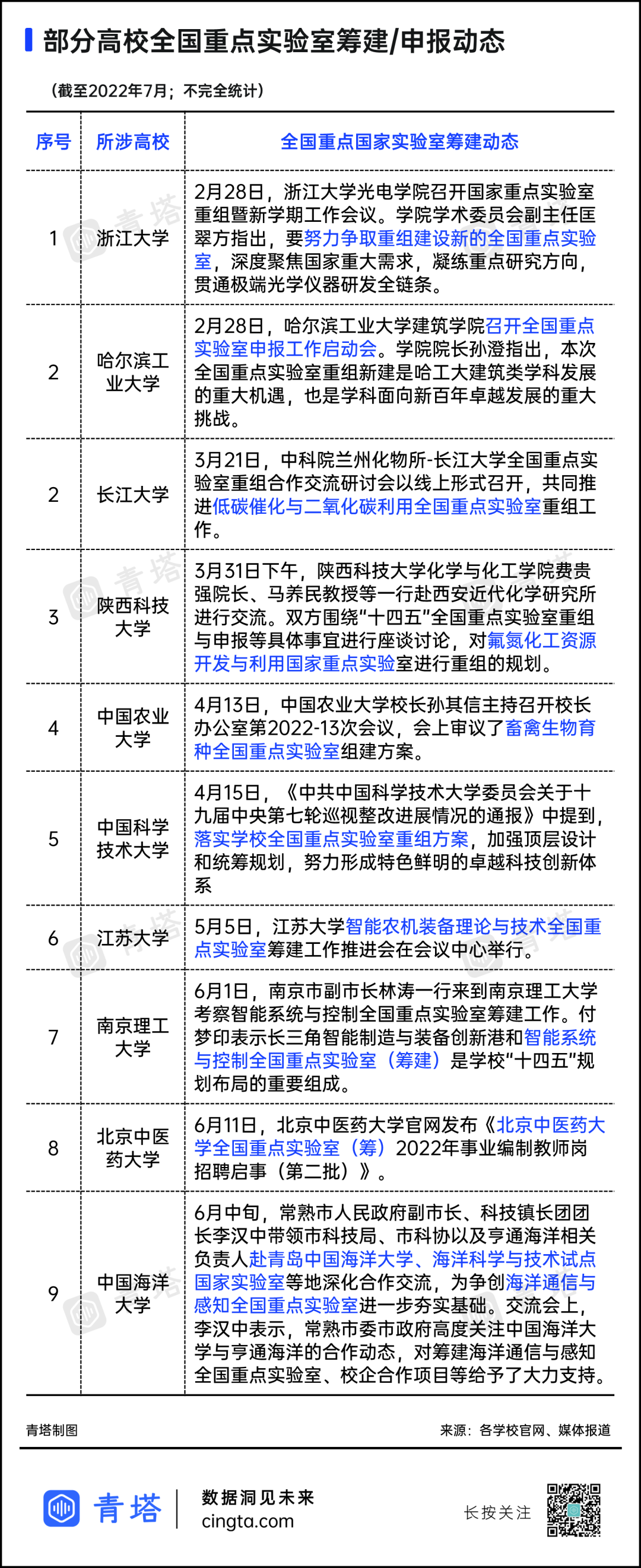 据青塔不完全统计,截至目前,已有超过60所国家重点实验室明确将参与到优化重组的进程之中,各大实验室重组的步伐也在不断加快。