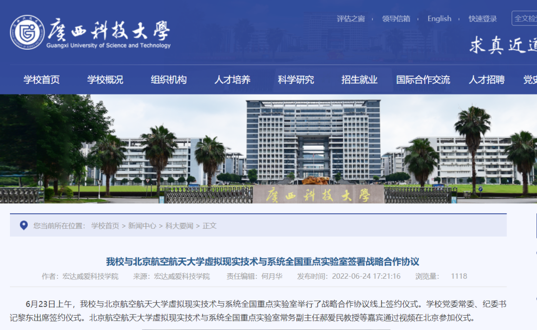 据官网消息,6月23日上午,广西科技大学与北京航空航天大学虚拟现实技术与系统全国重点实验室举行了战略合作协议线上签约仪式。