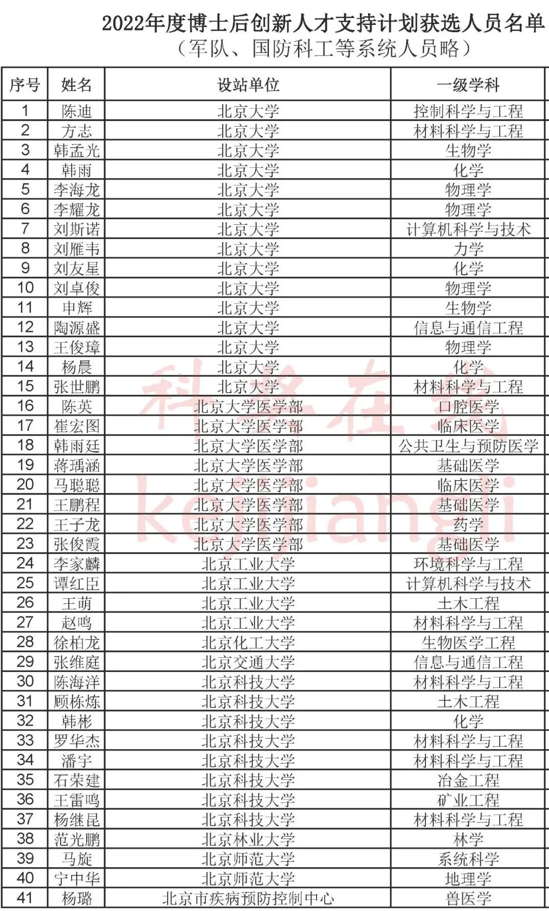 根据《全国博士后管委会办公室关于做好2022年度博士后创新人才支持计划实施工作的通知》(博管办〔2022〕8号),全国博士后管委会办公室、中国博士后科学基金会组织开展了2022年度博士后创新人才支持计划(以下简称“博新计划”)的申报和评审工作,最终确定了400名获选人员。现公布367名人员名单,军队、国防科工等系统获选人员另行通知。