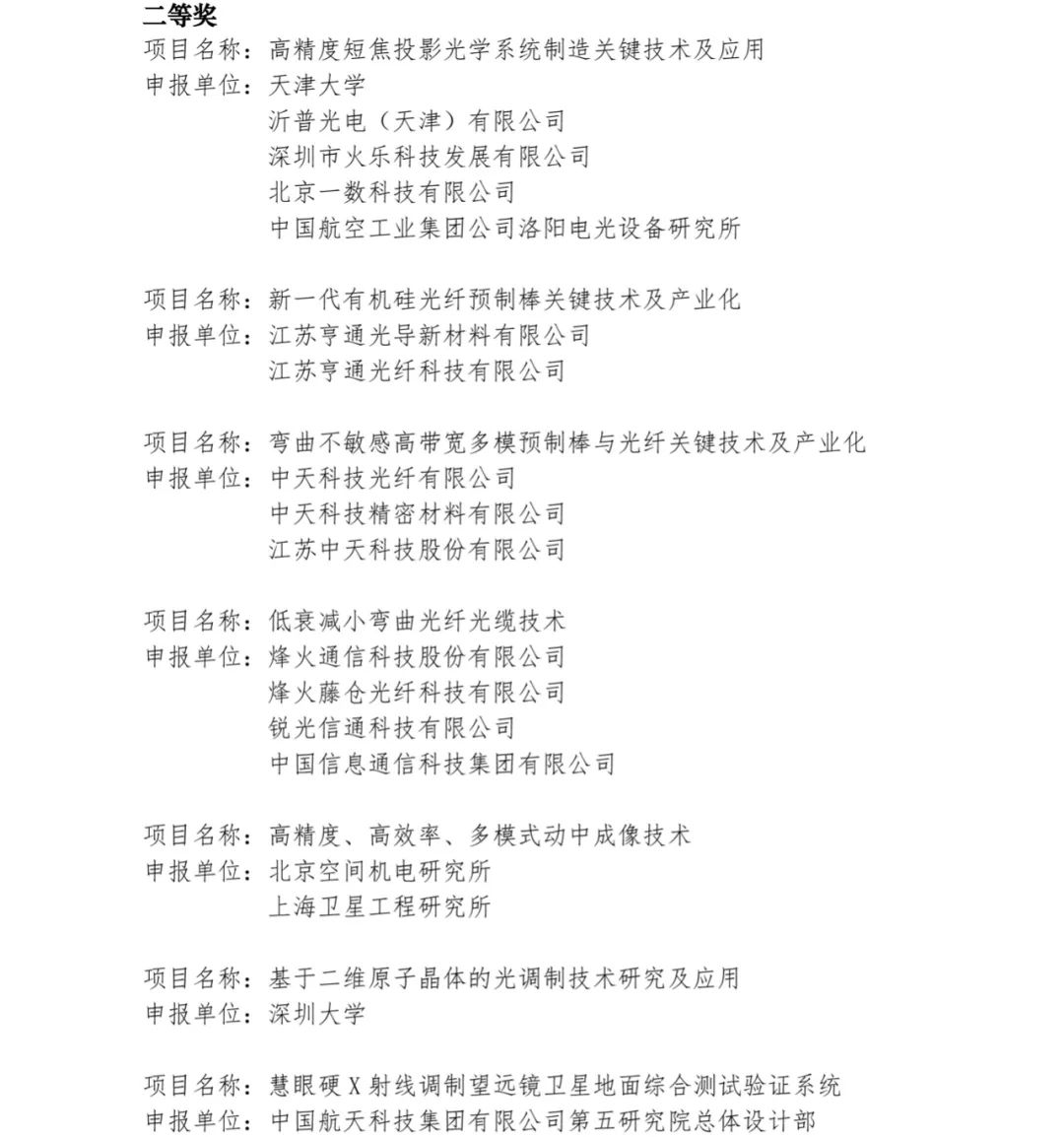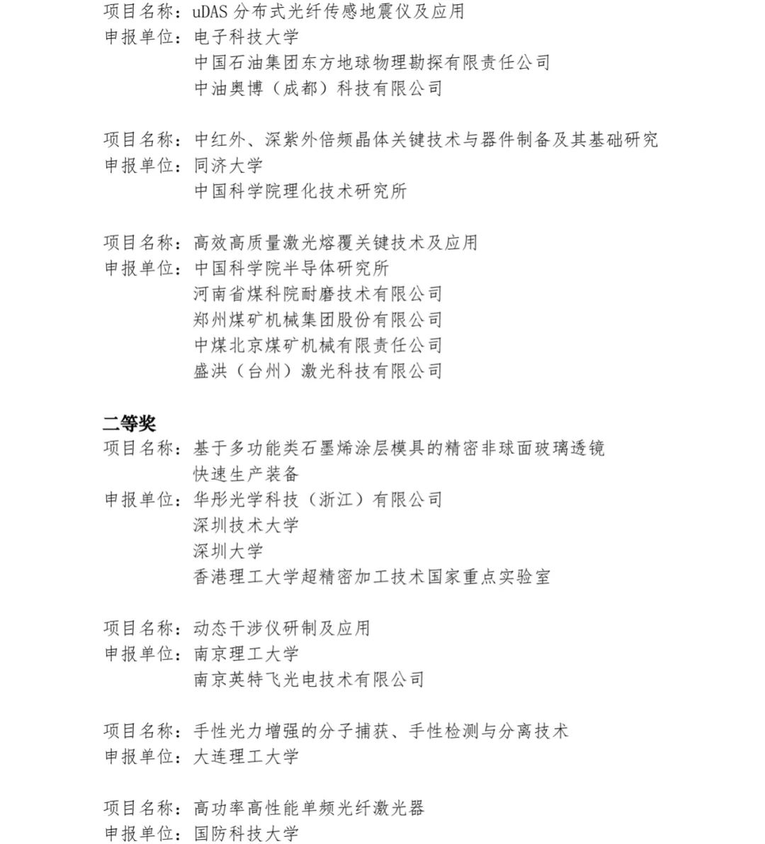 其中,技术发明奖一等奖4项、二等奖5项、三等奖1项;科技进步奖一等奖4项、二等奖10项、三等奖3项。根据《中国光学工程学会科技创新奖管理办法》,现予以公示。自公示之日起 10日内,有发现入选项目存在学术不端行为,或主要研究成果不能成立等严重问题者,可以向中国光学工程学会评奖办公室提出异议。