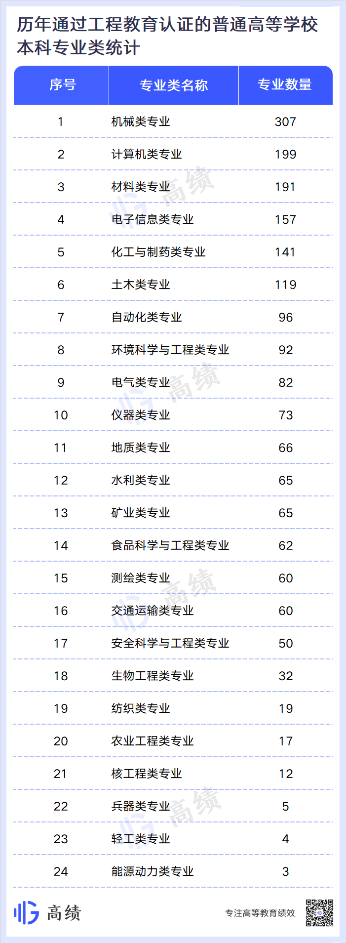 历年通过工程教育认证的本科专业名单中,专业数量最多的是机械类专业,共307个专业通过认证;其次是计算机类专业和材料类专业,分别通过199个、191个专业。各个本科专业类通过工程教育认证的专业数量如下: