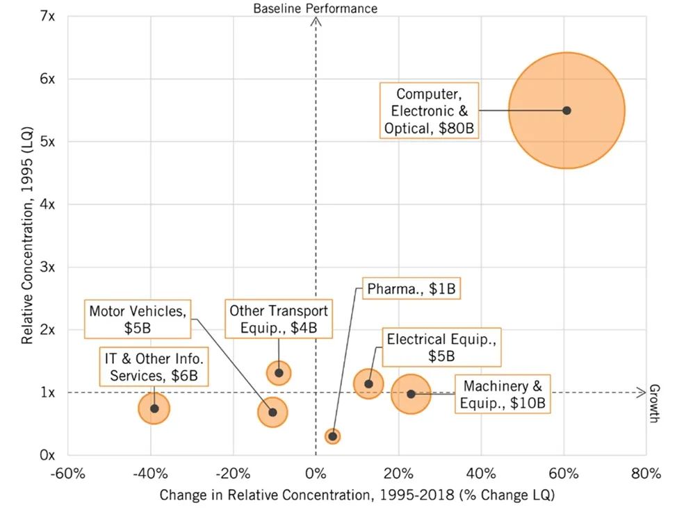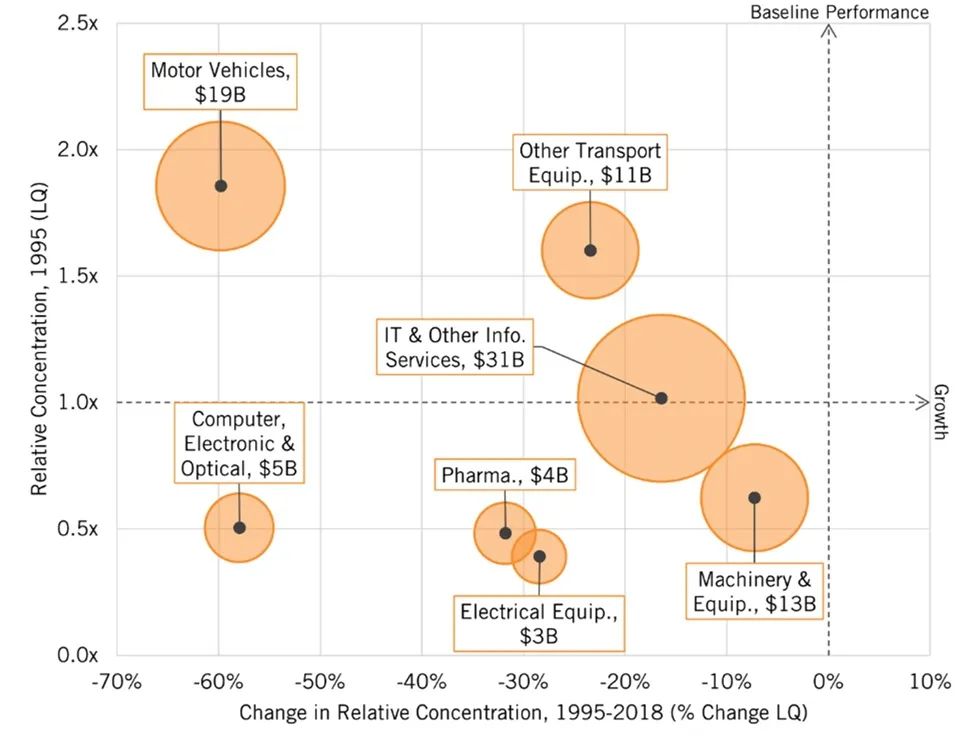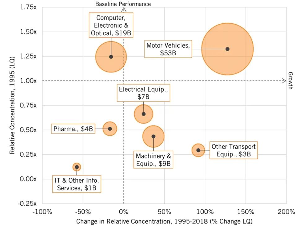 然而,当考虑到日本在全球经济中急剧萎缩的份额时,其先进制造业的表现却明显优于美国,集中度比美国高出50%以上,增加了其在机械设备和机动车辆方面的专业化。许多反对美国先进制造业战略的人士指出,日本在全球市场份额的丧失是产业战略注定要失败的证据。事实上,日本的先进制造业表现一直很稳定,而且其在日本经济中所占的份额明显高于美国。