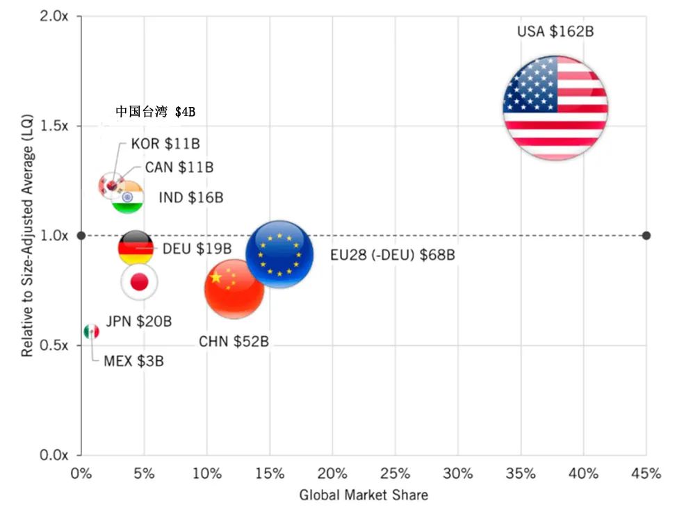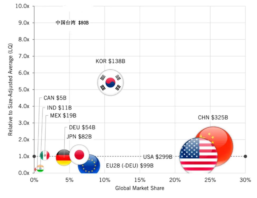 相对而言,中国台湾在该领域遥遥领先。截至2018年,中国台湾的产量几乎是调整后全球平均水平的9倍,这反映出台积电(TSMC)、联华电子(UMC)、联发科技(MediaTek)和宏基(Acer)等企业的全球领先地位。加拿大和印度在这一行业的专业程度最低(截至2018年,分别为全球平均水平的21%和27%),而欧盟28国(去除德国)的产量约为调整后全球平均水平的50%。