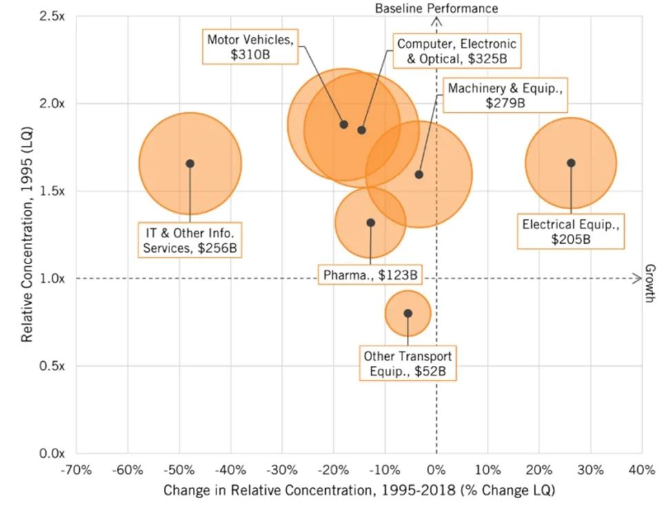 图9:1995-2018年美国经济中先进产业相对集中度的变化