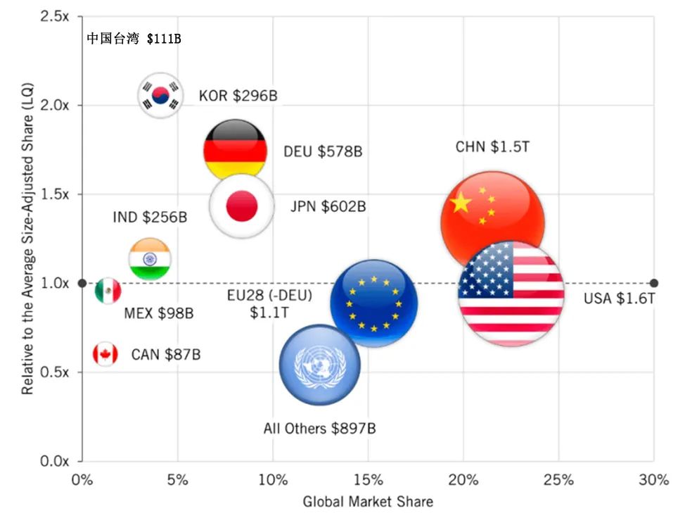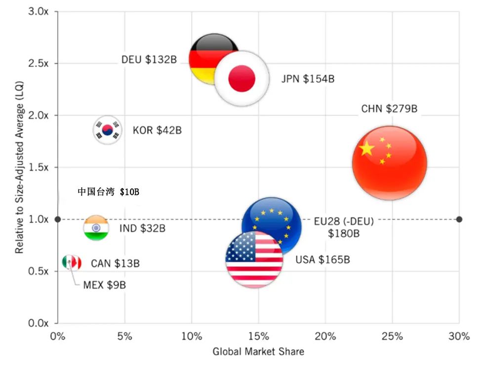 1995~2018年,中国的增长最为显著,其全球份额增长了近460%。印度也迅速增长,但基数很小。欧盟28国(去除德国)的全球份额从17%下降到13%。加拿大、日本和美国的份额也出现下跌——分别为59%、56%和38%。韩国、印度和墨西哥的份额有所增加,尽管起点较低。有趣的是,在北美贸易伙伴关系的背景下,加拿大和墨西哥的总份额增加了18%,但加拿大出现下降,墨西哥则有所上升。