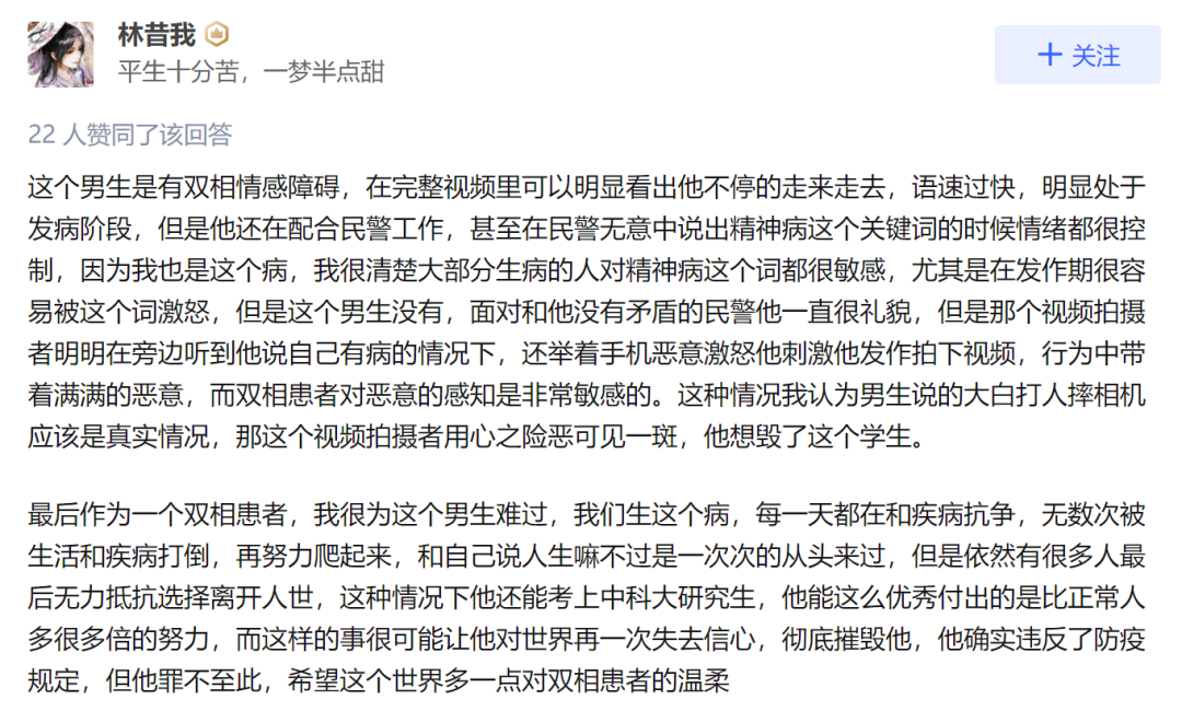 据另一名知乎网友分析,该男生是有双相情感障碍,并以自己现身说法。