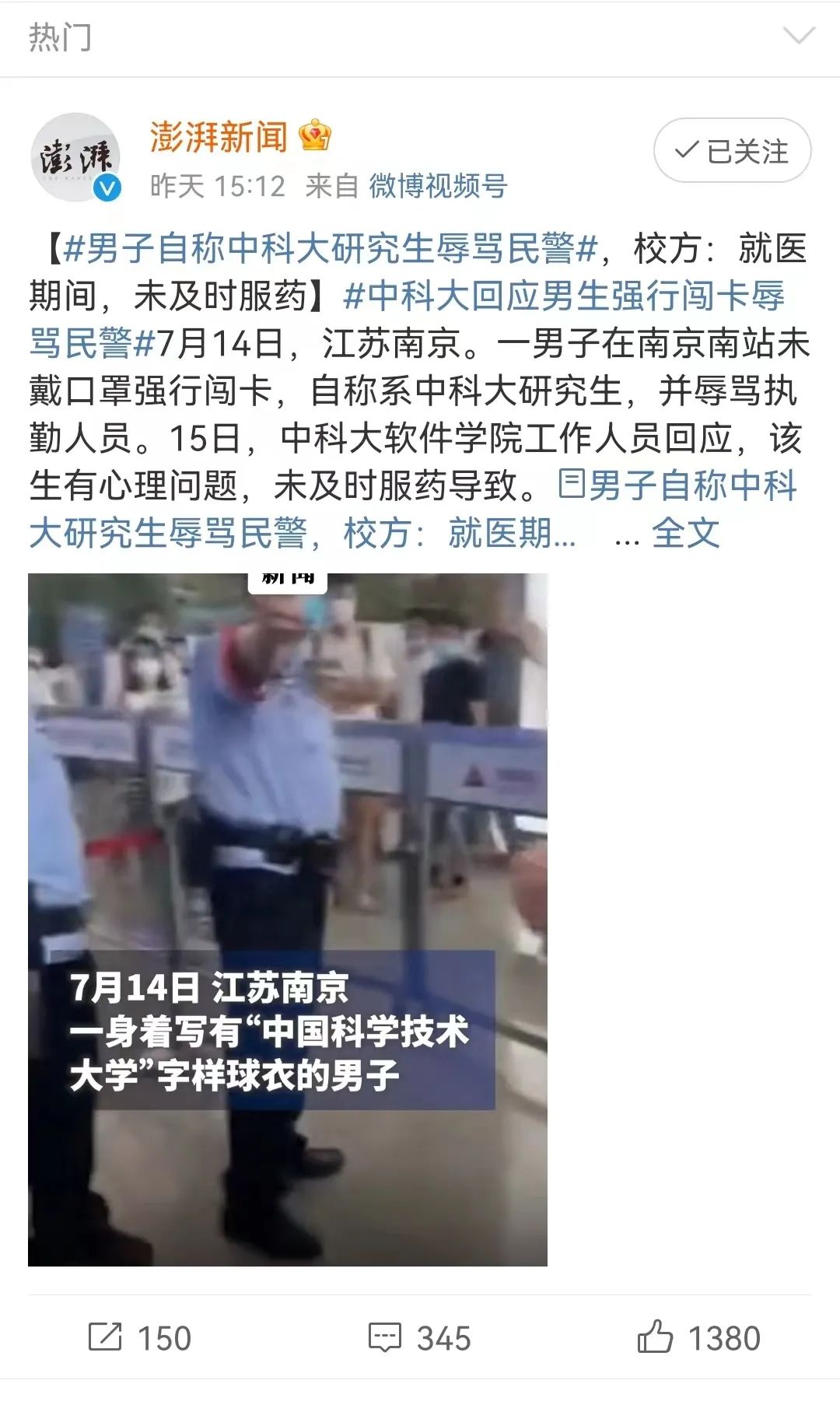 据澎湃新闻报道,7月14日,一男子在南京南站未戴口罩强行闯卡,并且称自己是中科大研究生,多次辱骂执勤人员。并声称我导师是某某,找我导师去。15日,中科大软件学院工作人员回应,该生有心理问题,未及时服药导致。