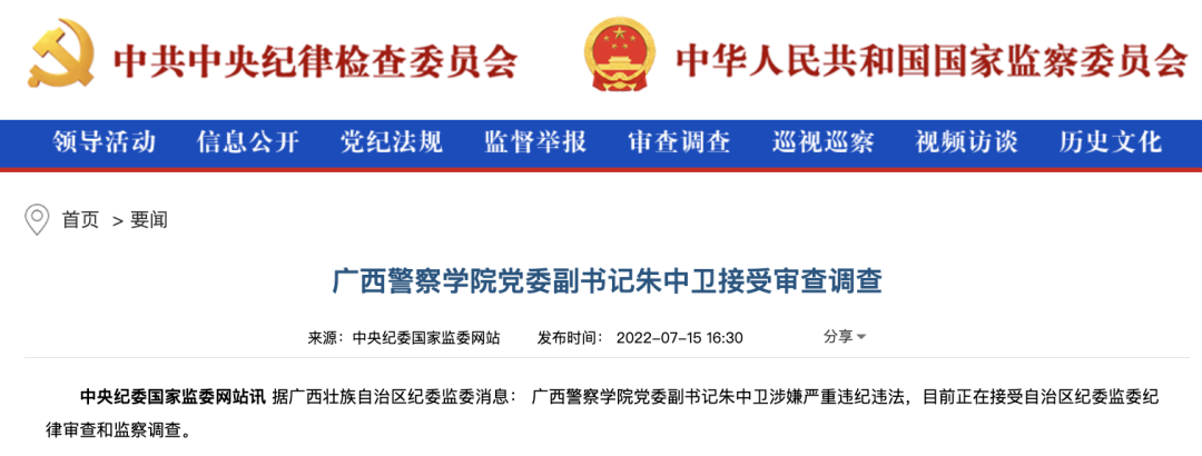 7月15日下午,中央纪委国家监委网站 发布消息, 中央纪委国家监委网站讯 据广西壮族自治区纪委监委消息:广西警察学院党委副书记朱中卫涉嫌严重违纪违法,目前正在接受自治区纪委监委纪律审查和监察调查。