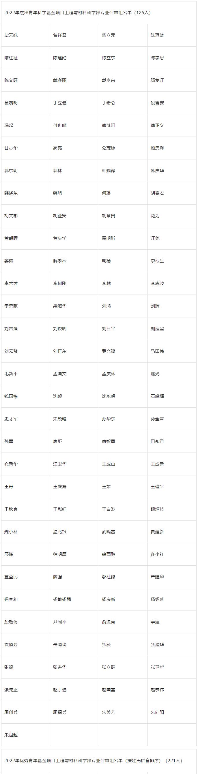 日前,国家自然科学基金委工程与材料科学部公布了2022年杰出青年科学基金项目专业评审组名单125人,优青项目评审组名单221人,重点项目(含重点国际(地区)合作研究项目)评审组名单216人。