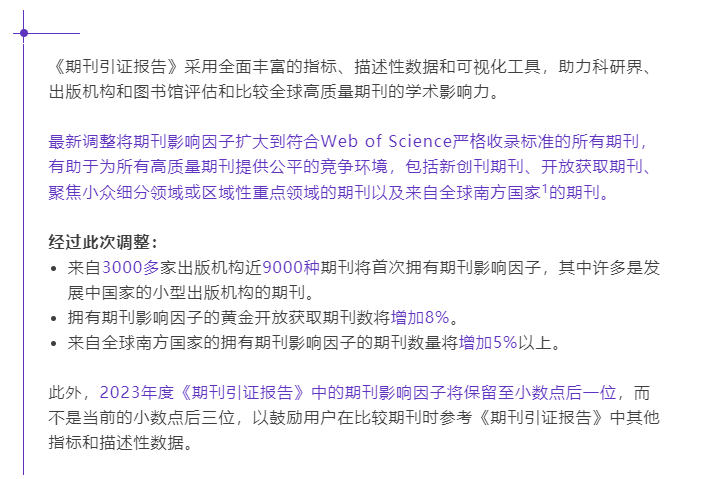 最新调整将期刊影响因子扩大到符合Web of Science严格收录标准的所有期刊,有助于为所有高质量期刊提供公平的竞争环境,包括新创刊期刊、开放获取期刊、聚焦小众细分领域或区域性重点领域的期刊以及来自全球南方国家1的期刊。
