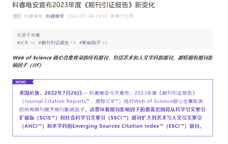 科睿唯安今天宣布,2023年度《期刊引证报告》(Journal Citation Reports,简称JCR)将对Web of Science核心合集收录的所有期刊赋予期刊影响因子。