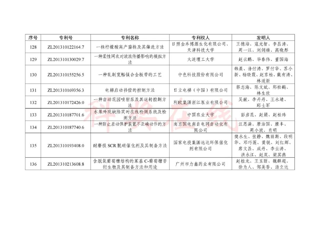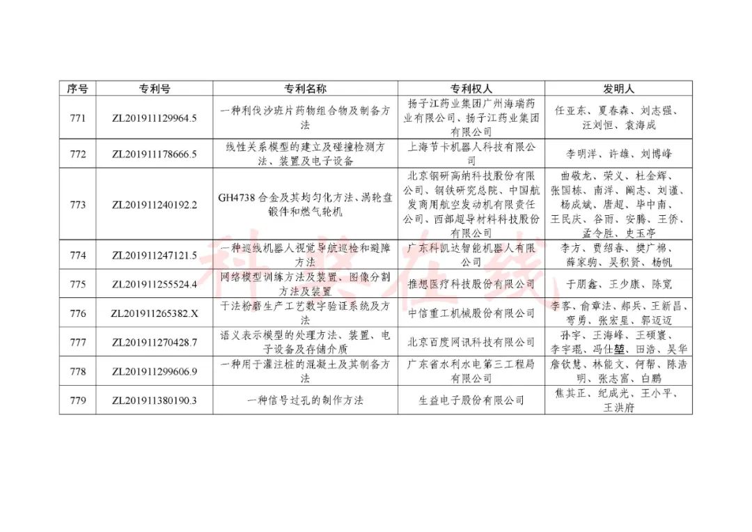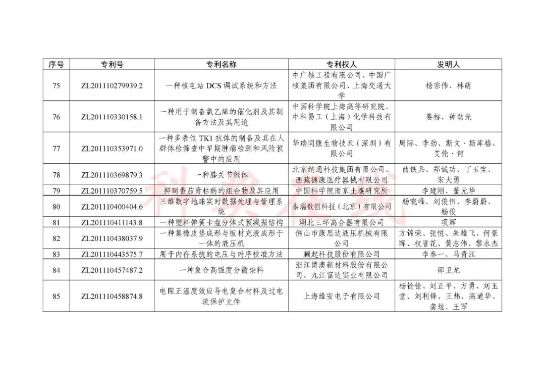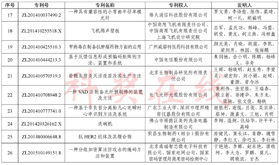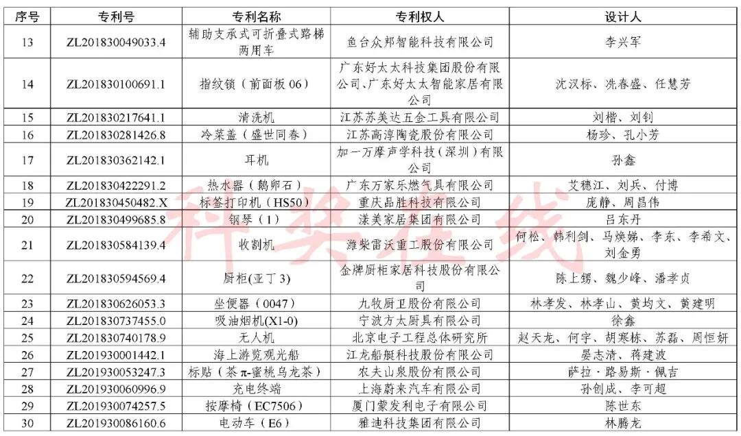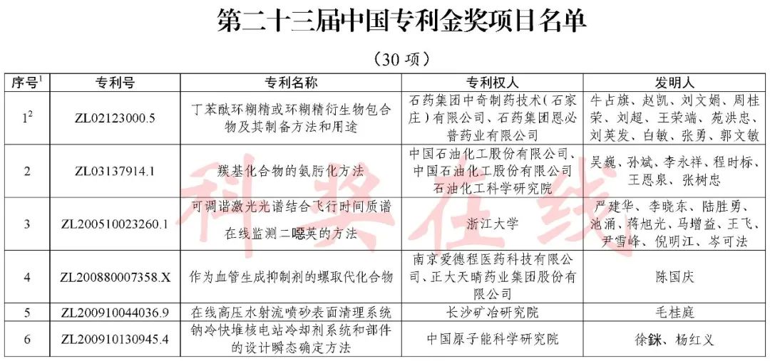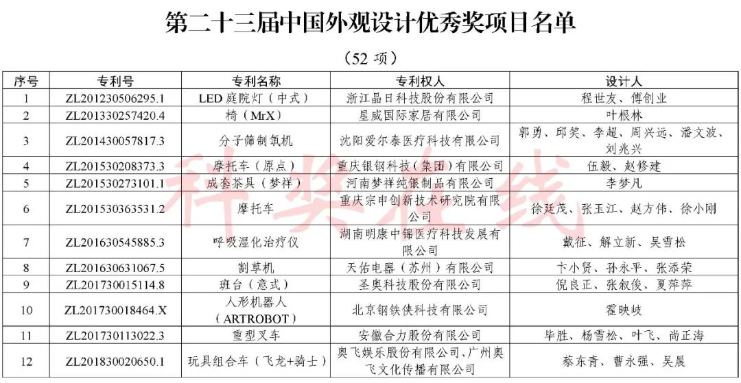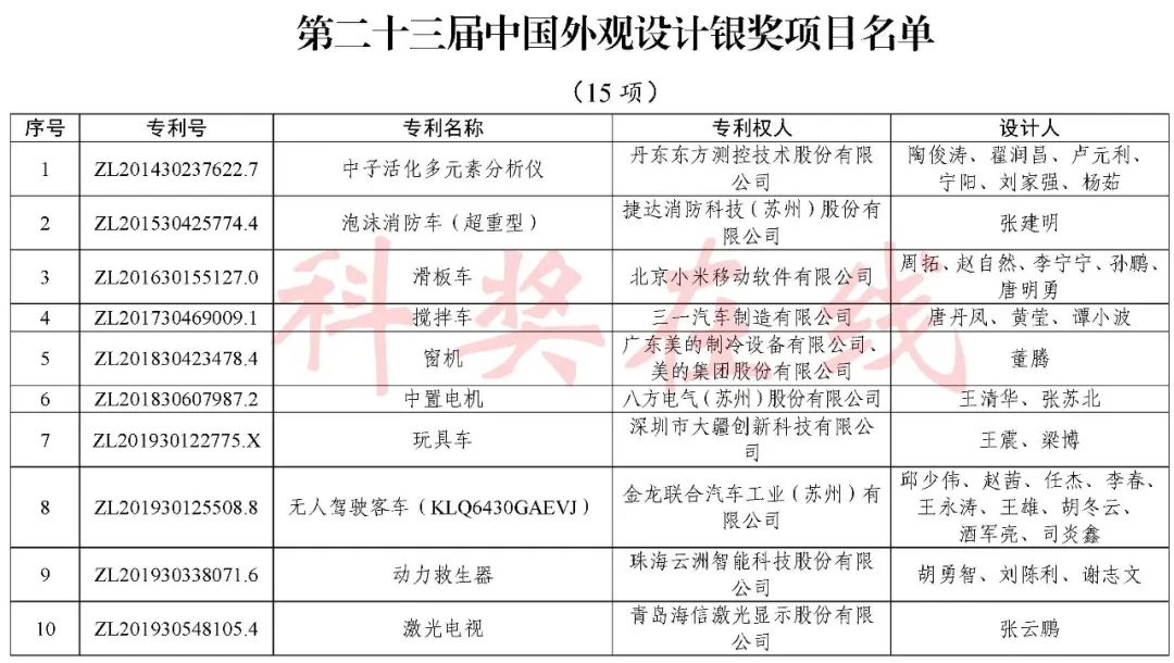 根据《中国专利奖评奖办法》规定,经国务院有关部门知识产权工作管理机构、地方知识产权局、有关全国性行业协会,以及中国科学院院士和中国工程院院士等推荐,中国专利奖评审委员会评审,社会公示,国家知识产权局和世界知识产权组织决定授予“丁苯酞环糊精或环糊精衍生物包合物及其制备方法和用途”等30项发明、实用新型专利中国专利金奖,“伽马刀”等10项外观设计专利中国外观设计金奖;国家知识产权局决定授予“一种治疗小儿食积咳嗽的中药组合物及其制备方法”等60项发明、实用新型专利中国专利银奖,“中子活化多元素分析仪”等15项外观设计专利中国外观设计银奖;国家知识产权局决定授予“有效部位药物沉积得到改善的干粉组合物”等791项发明、实用新型专利中国专利优秀奖,“LED庭院灯(中式)”等52项外观设计专利中国外观设计优秀奖;国家知识产权局决定授予江苏省知识产权局等8家单位中国专利奖最佳组织奖,中国科学院科技促进发展局等20家单位中国专利奖优秀组织奖,舒兴田等18位院士中国专利奖最佳推荐奖。
