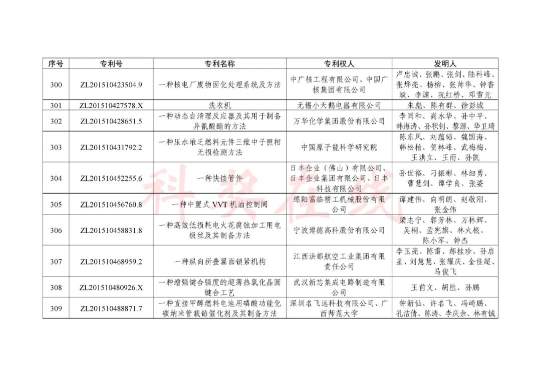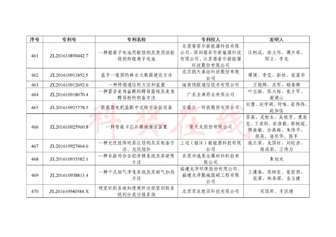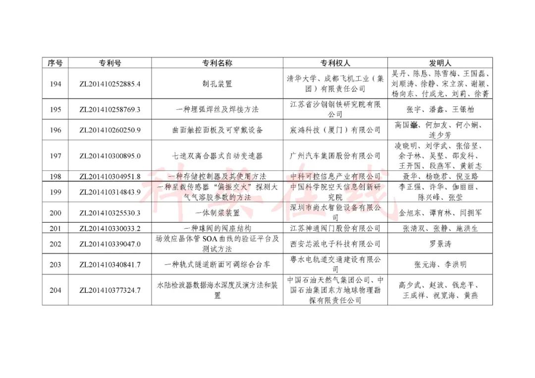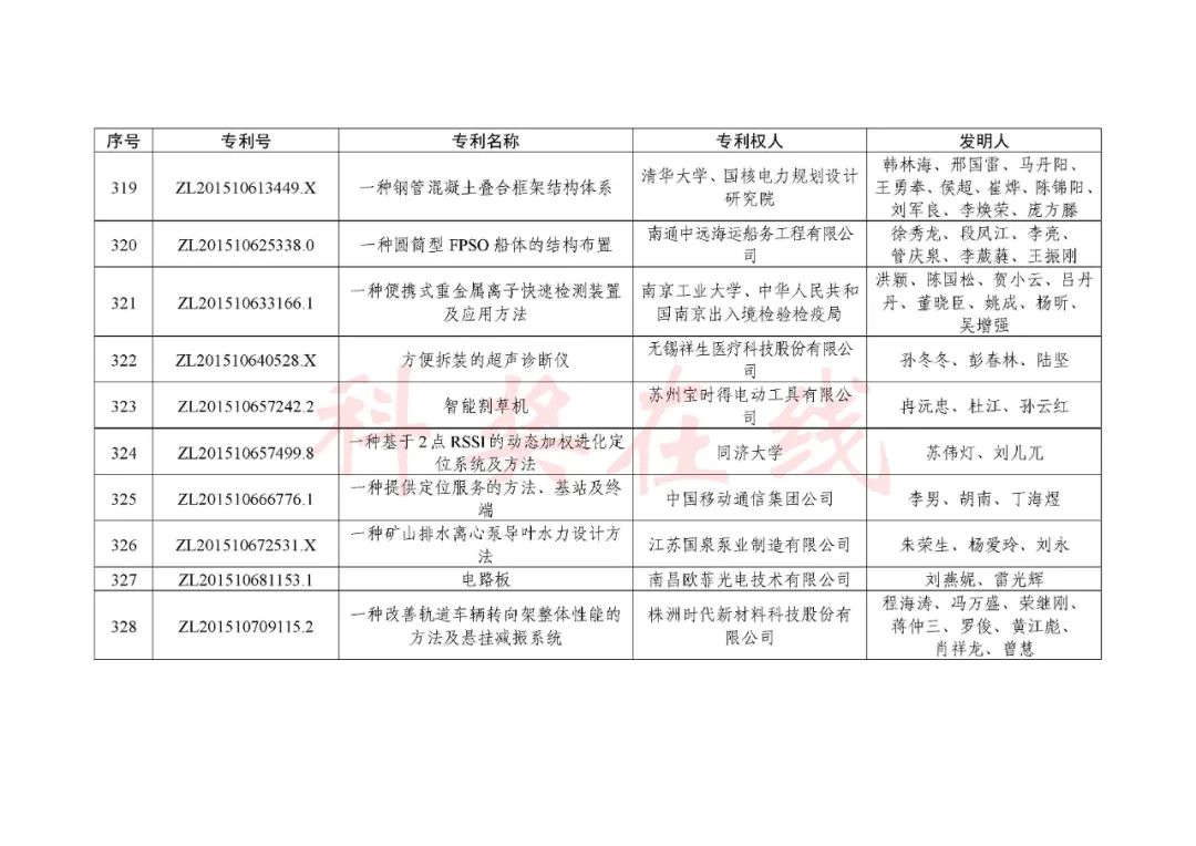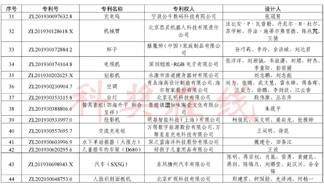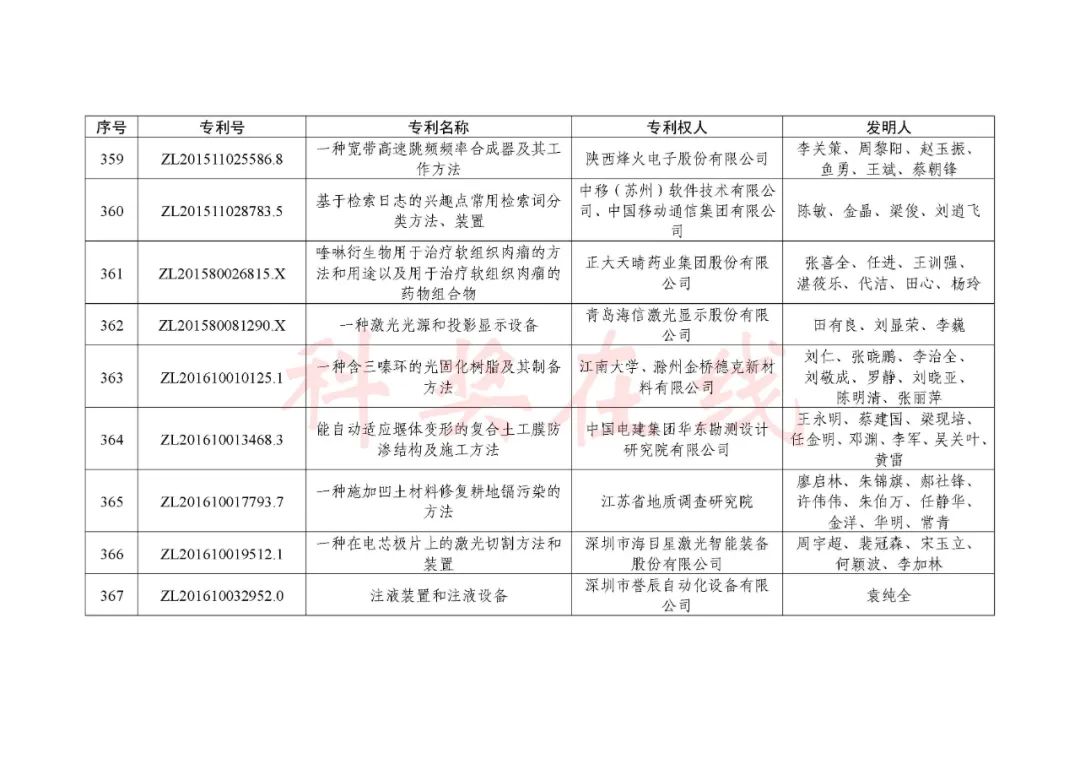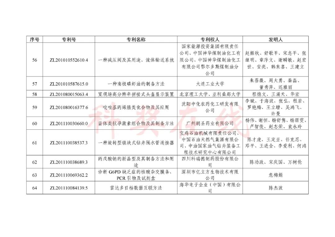 根据《中国专利奖评奖办法》规定,经国务院有关部门知识产权工作管理机构、地方知识产权局、有关全国性行业协会,以及中国科学院院士和中国工程院院士等推荐,中国专利奖评审委员会评审,社会公示,国家知识产权局和世界知识产权组织决定授予“丁苯酞环糊精或环糊精衍生物包合物及其制备方法和用途”等30项发明、实用新型专利中国专利金奖,“伽马刀”等10项外观设计专利中国外观设计金奖;国家知识产权局决定授予“一种治疗小儿食积咳嗽的中药组合物及其制备方法”等60项发明、实用新型专利中国专利银奖,“中子活化多元素分析仪”等15项外观设计专利中国外观设计银奖;国家知识产权局决定授予“有效部位药物沉积得到改善的干粉组合物”等791项发明、实用新型专利中国专利优秀奖,“LED庭院灯(中式)”等52项外观设计专利中国外观设计优秀奖;国家知识产权局决定授予江苏省知识产权局等8家单位中国专利奖最佳组织奖,中国科学院科技促进发展局等20家单位中国专利奖优秀组织奖,舒兴田等18位院士中国专利奖最佳推荐奖。