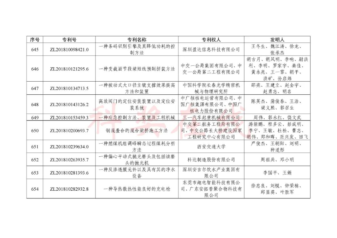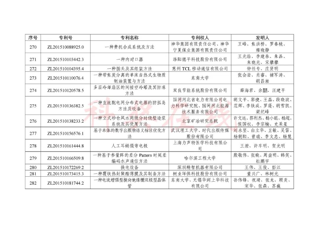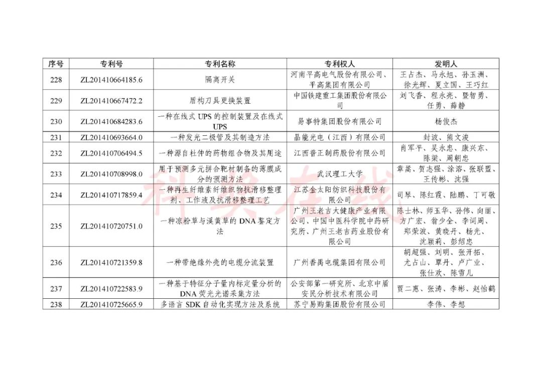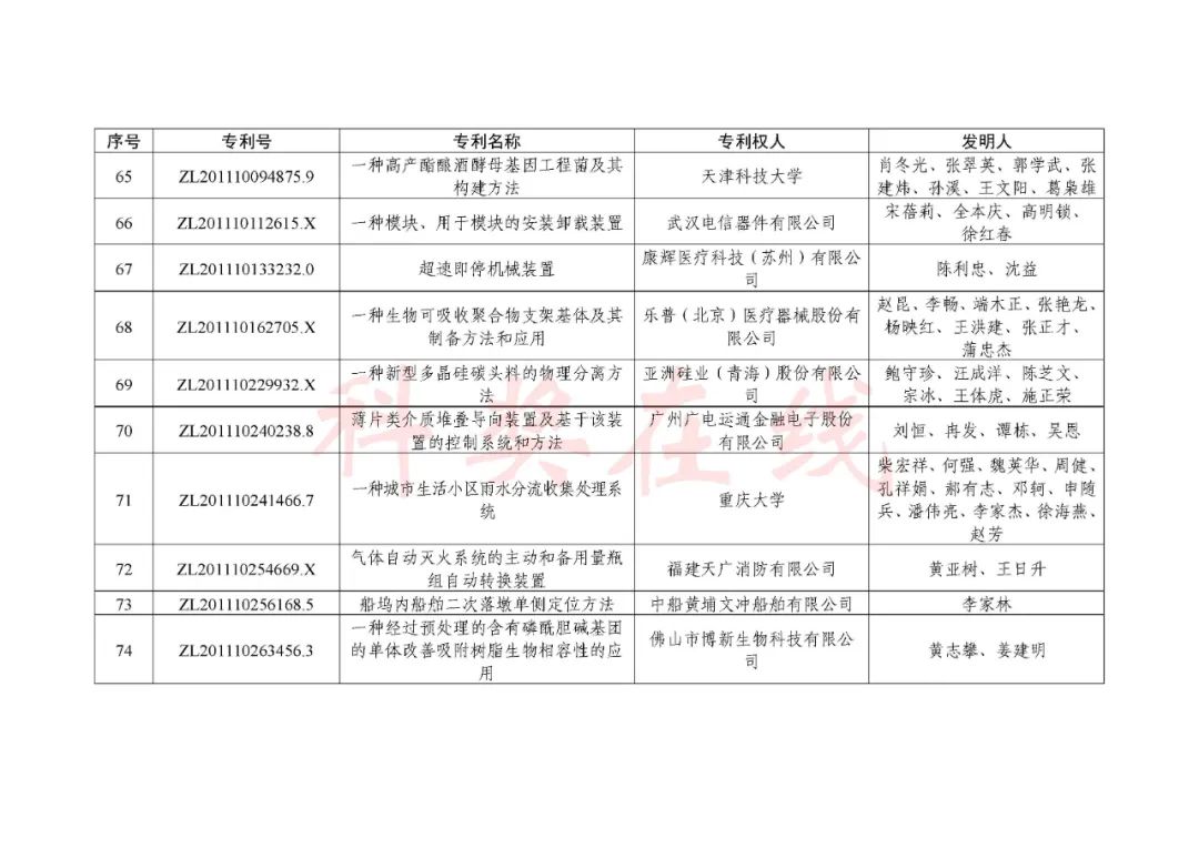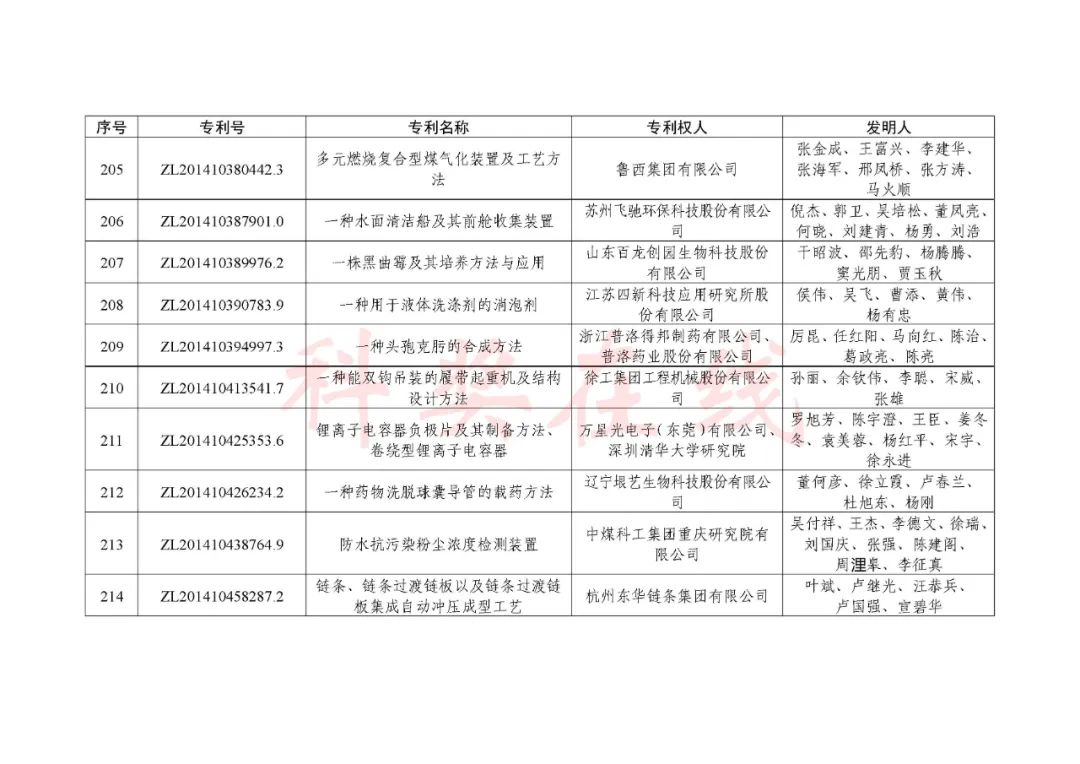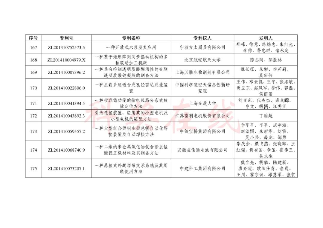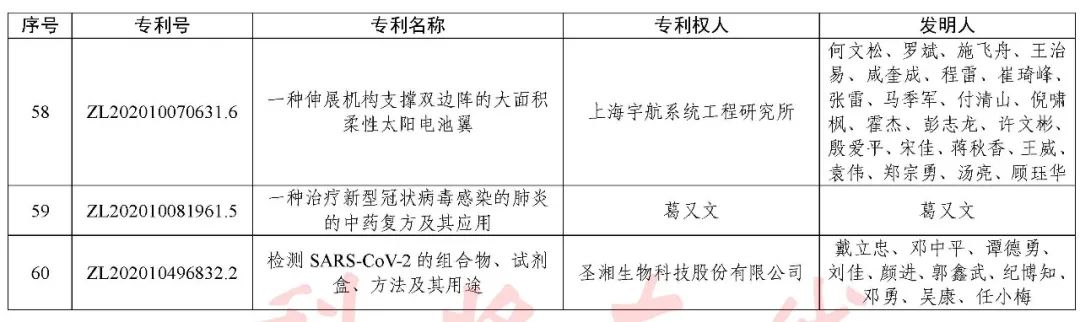 根据《中国专利奖评奖办法》规定,经国务院有关部门知识产权工作管理机构、地方知识产权局、有关全国性行业协会,以及中国科学院院士和中国工程院院士等推荐,中国专利奖评审委员会评审,社会公示,国家知识产权局和世界知识产权组织决定授予“丁苯酞环糊精或环糊精衍生物包合物及其制备方法和用途”等30项发明、实用新型专利中国专利金奖,“伽马刀”等10项外观设计专利中国外观设计金奖;国家知识产权局决定授予“一种治疗小儿食积咳嗽的中药组合物及其制备方法”等60项发明、实用新型专利中国专利银奖,“中子活化多元素分析仪”等15项外观设计专利中国外观设计银奖;国家知识产权局决定授予“有效部位药物沉积得到改善的干粉组合物”等791项发明、实用新型专利中国专利优秀奖,“LED庭院灯(中式)”等52项外观设计专利中国外观设计优秀奖;国家知识产权局决定授予江苏省知识产权局等8家单位中国专利奖最佳组织奖,中国科学院科技促进发展局等20家单位中国专利奖优秀组织奖,舒兴田等18位院士中国专利奖最佳推荐奖。