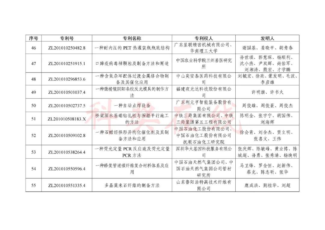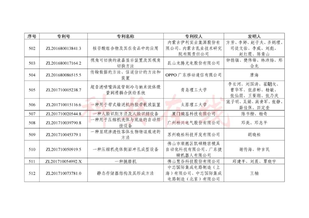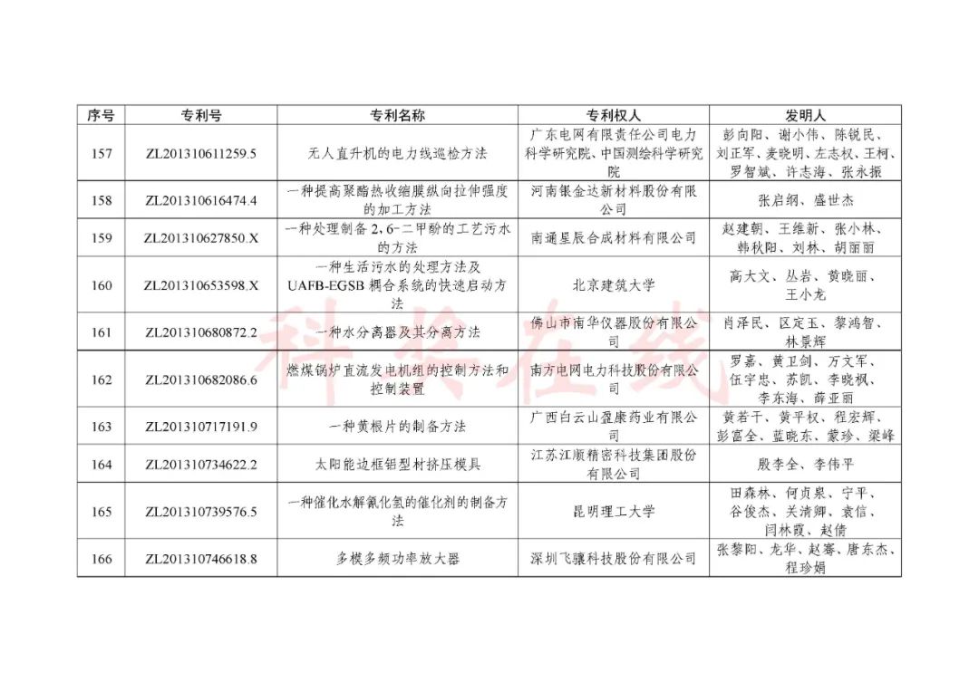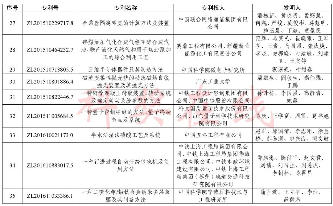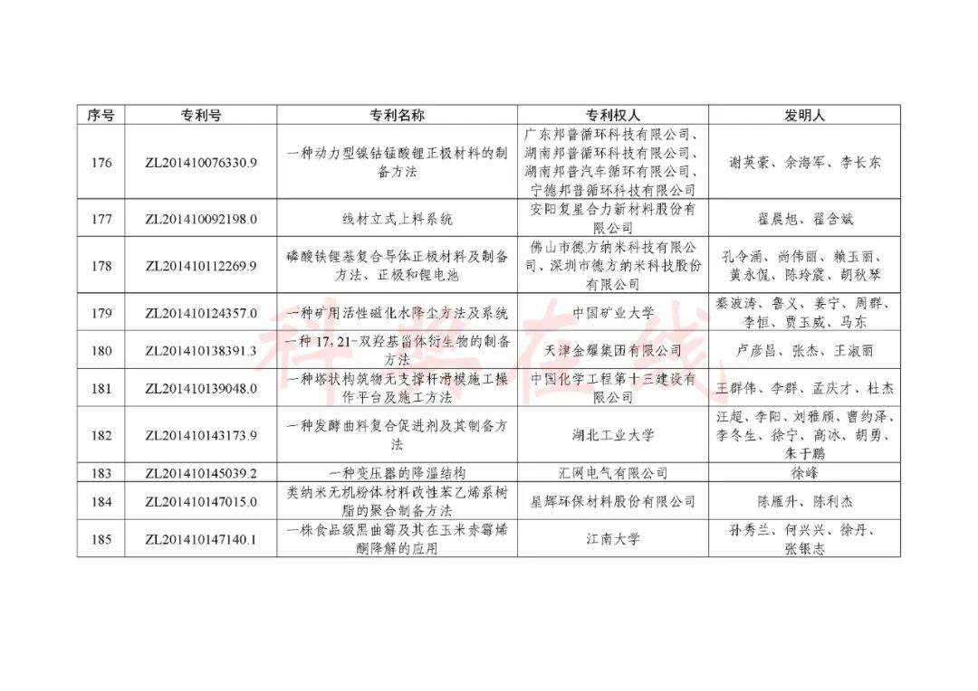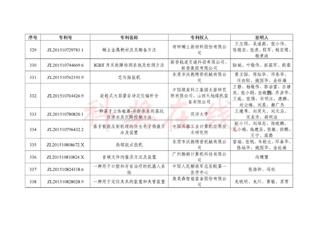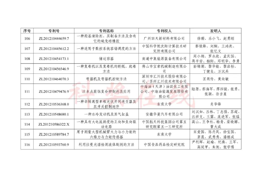 根据《中国专利奖评奖办法》规定,经国务院有关部门知识产权工作管理机构、地方知识产权局、有关全国性行业协会,以及中国科学院院士和中国工程院院士等推荐,中国专利奖评审委员会评审,社会公示,国家知识产权局和世界知识产权组织决定授予“丁苯酞环糊精或环糊精衍生物包合物及其制备方法和用途”等30项发明、实用新型专利中国专利金奖,“伽马刀”等10项外观设计专利中国外观设计金奖;国家知识产权局决定授予“一种治疗小儿食积咳嗽的中药组合物及其制备方法”等60项发明、实用新型专利中国专利银奖,“中子活化多元素分析仪”等15项外观设计专利中国外观设计银奖;国家知识产权局决定授予“有效部位药物沉积得到改善的干粉组合物”等791项发明、实用新型专利中国专利优秀奖,“LED庭院灯(中式)”等52项外观设计专利中国外观设计优秀奖;国家知识产权局决定授予江苏省知识产权局等8家单位中国专利奖最佳组织奖,中国科学院科技促进发展局等20家单位中国专利奖优秀组织奖,舒兴田等18位院士中国专利奖最佳推荐奖。